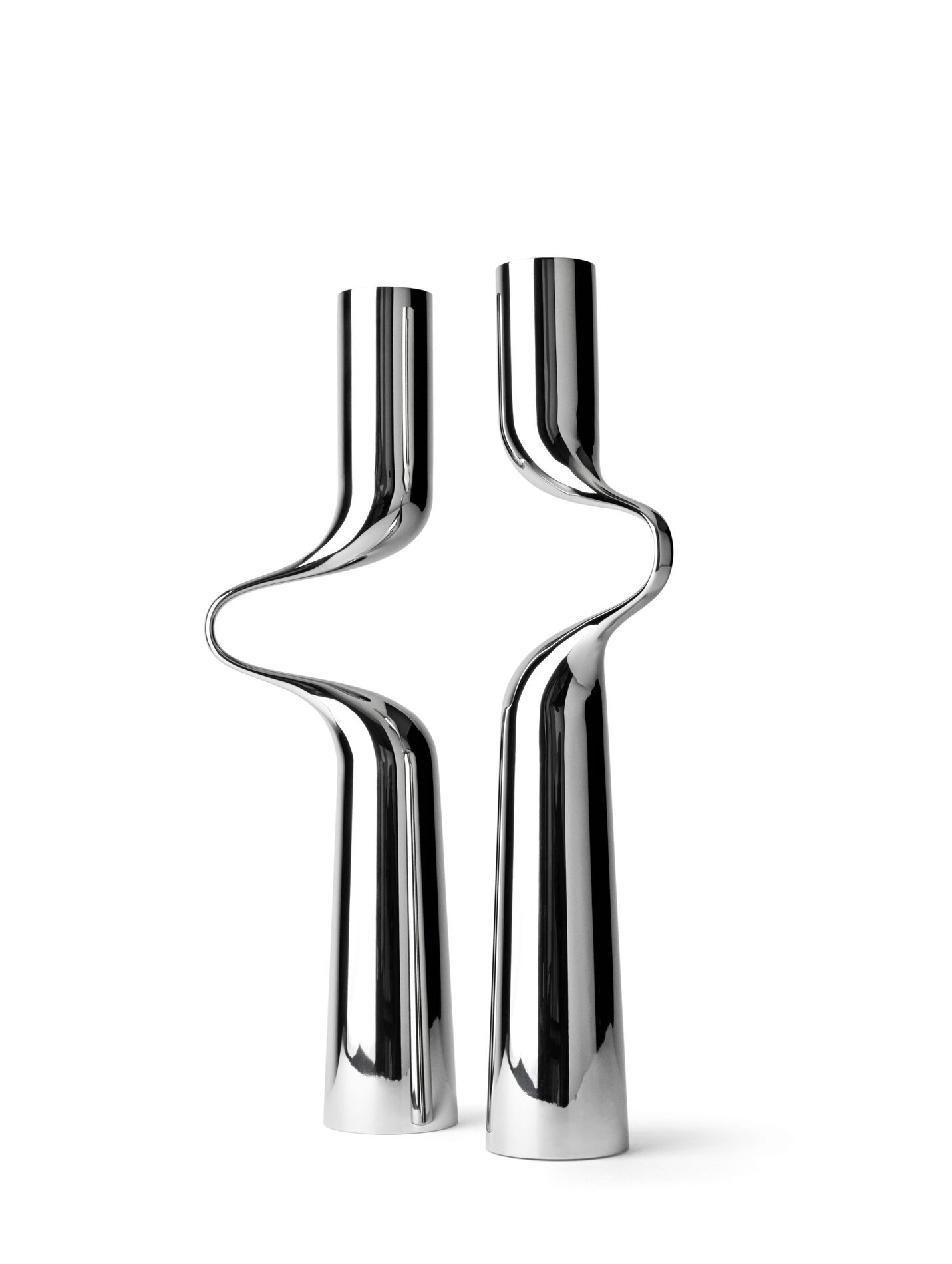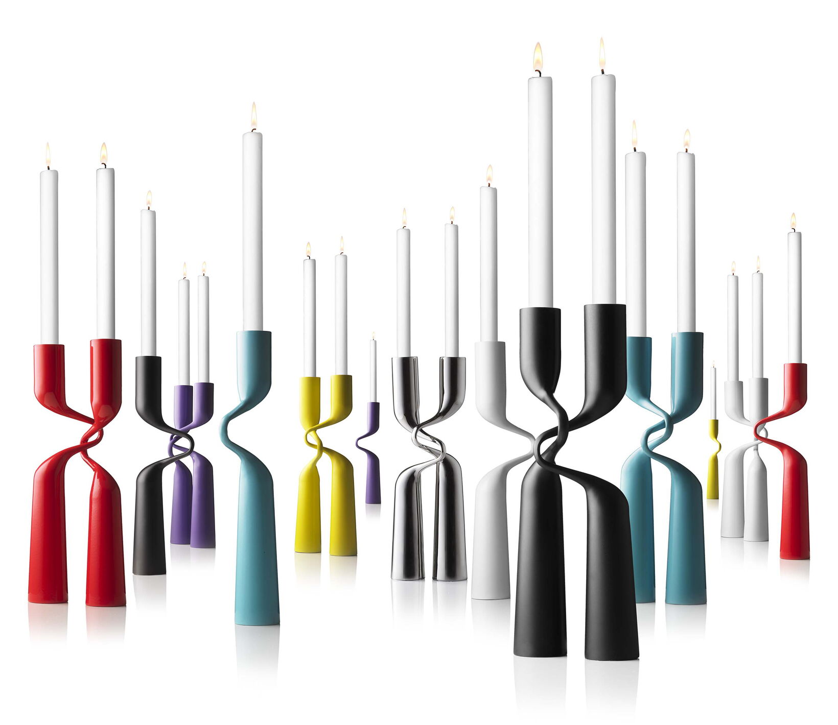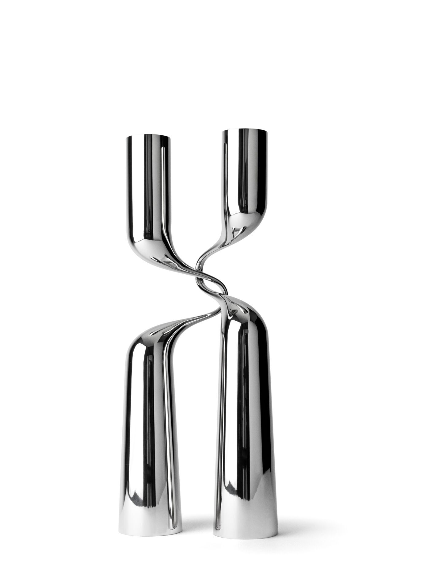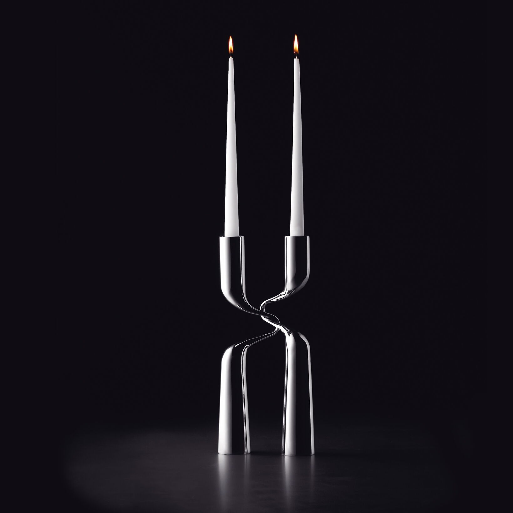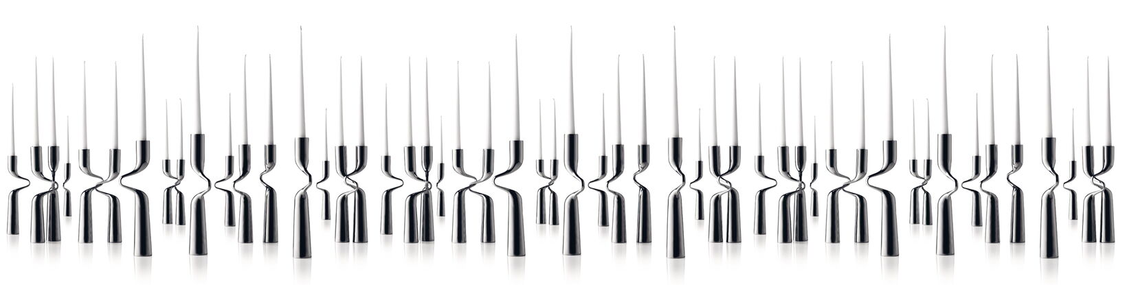 Ein Paar in tanzender Umarmung ist das Thema des Kerzenleuchters Double. Feine Eleganz entsteht im Kontrast der schwungvollen Bewegung des „Arms“ zu dem geradlinigen „Körper“ des Kerzenleuchters. Die elegante Form besticht auch in der größeren Variante als imposanter Bodenleuchter. Double ist in seinen verschiedenen Ausführungen auch deshalb ein großer Markterfolg, weil sich der „zweiteilige“ Leuchter besonders als Hochzeitsgeschenk in unterschiedlichen Preislagen anbietet.