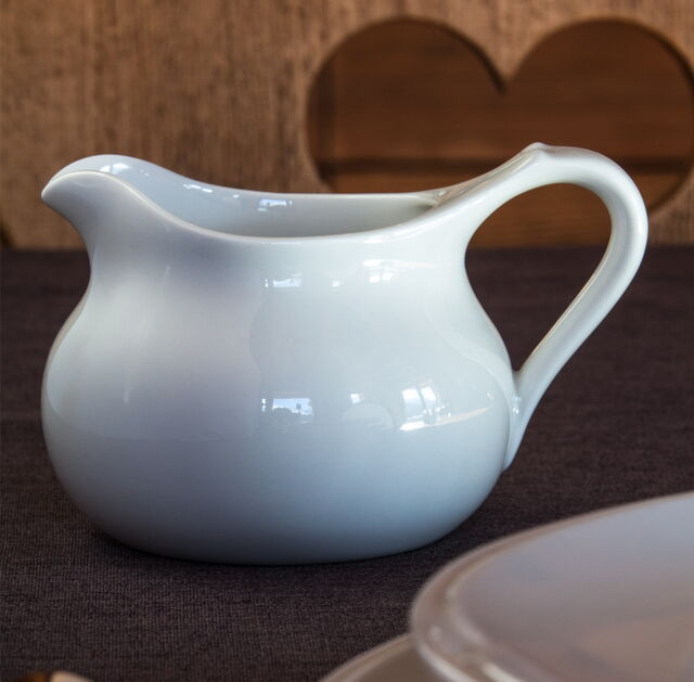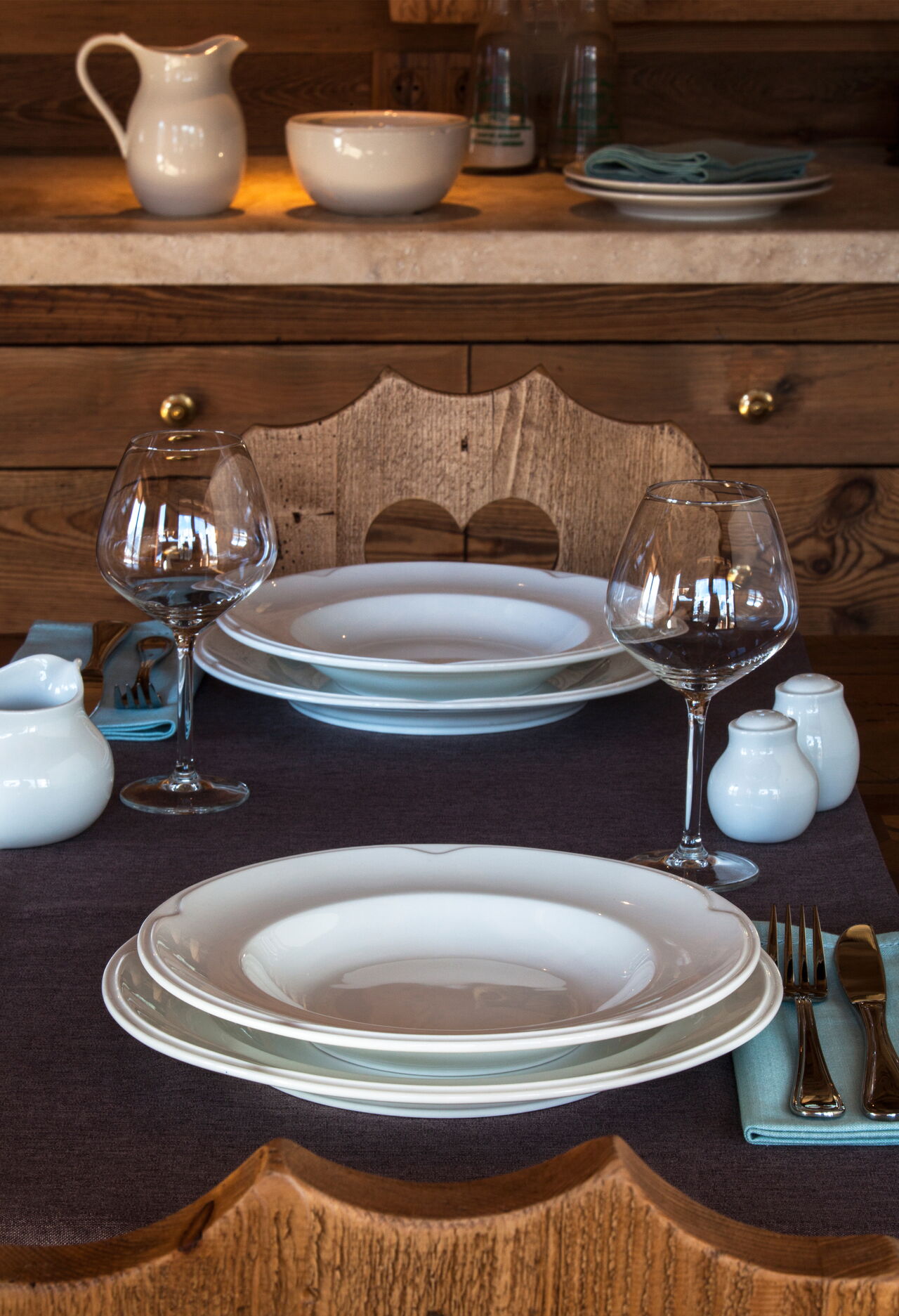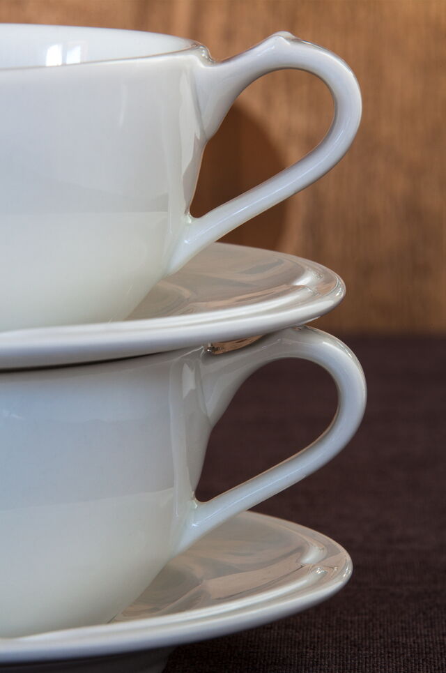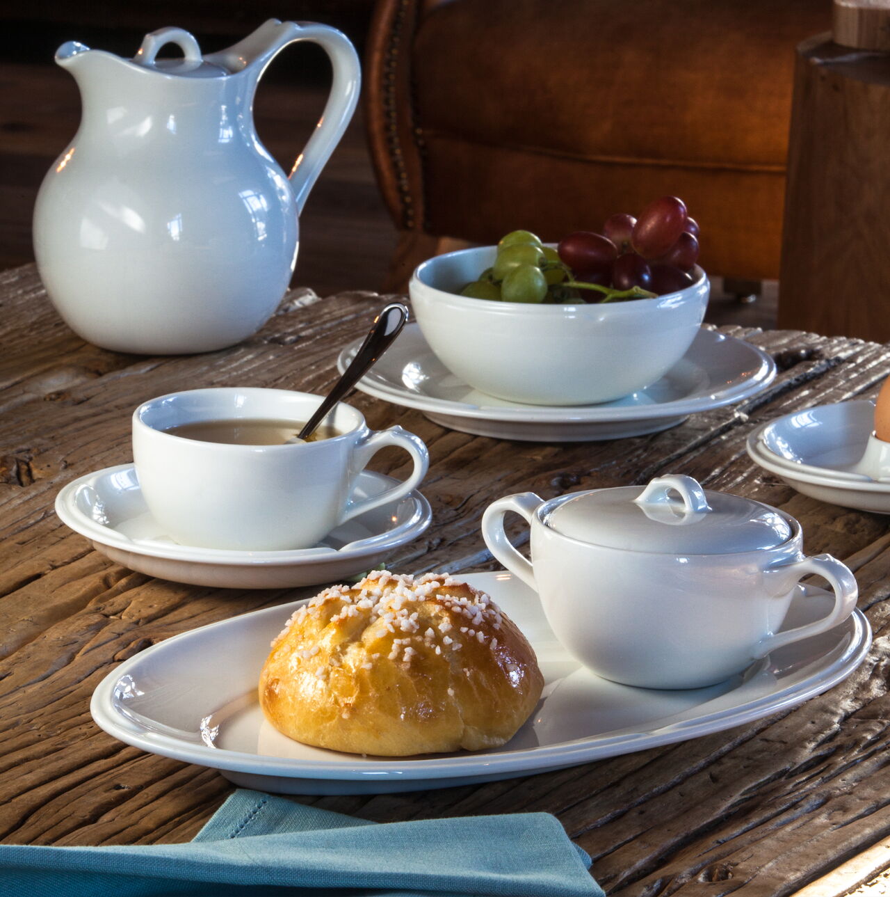 Das Hotelservice Anna greift traditionelle Formen im rustikalen Chalet-Stil auf: Die Kannenform und eine erhöhte Untertasse spielen auf traditionelle Wasserkrüge an, die zusammen mit einer Waschschale benutzt wurden. Doch Anna bietet mehr als Tradition. So sind die Reliefelemente am Henkel nicht nur dekorativ, sondern bieten auch dem Daumen beim Greifen eine feste Position. Anna ist zudem konsequent für moderne Fertigungsmethoden entworfen worden. Denn die dekorative Fünfteilung der Außenform von traditionellen Tellern wird hier auf der Fahne als dezentes Relief eingesetzt, so bleibt die Produktion mit glattem Tellerrand trotz des Dekors einfach.