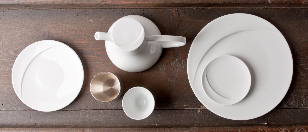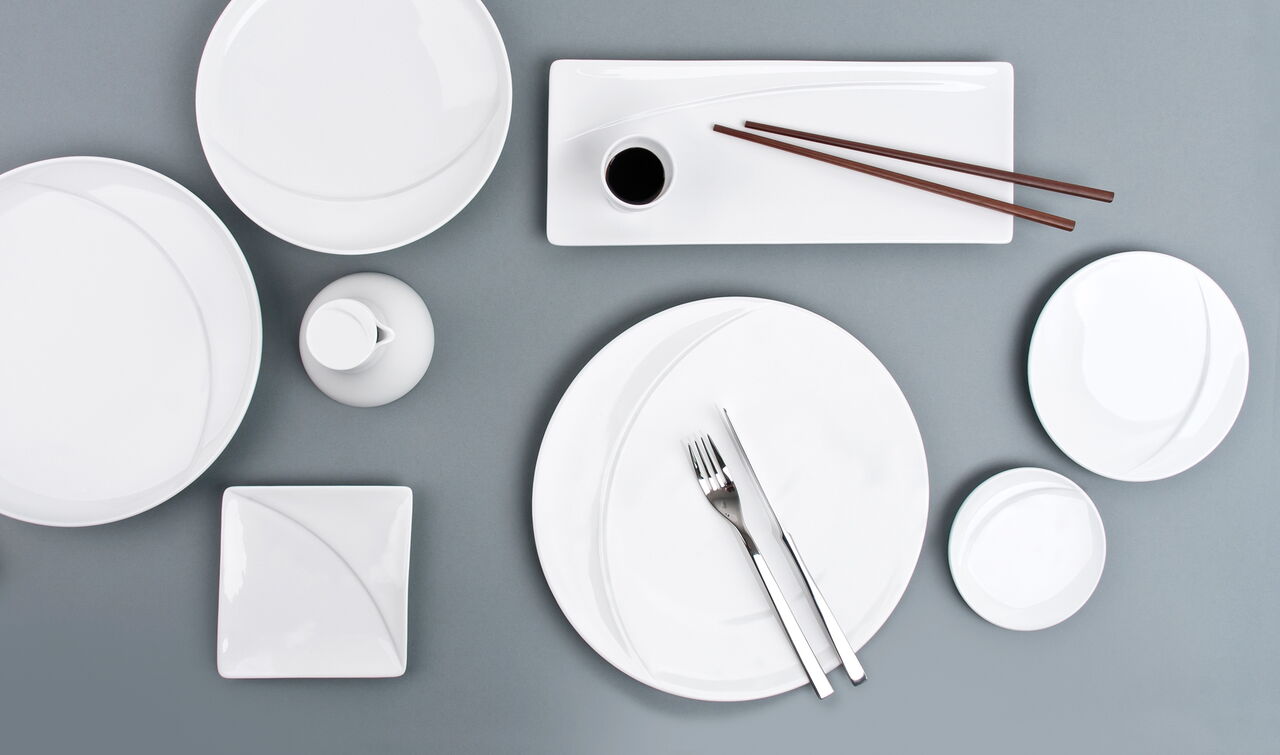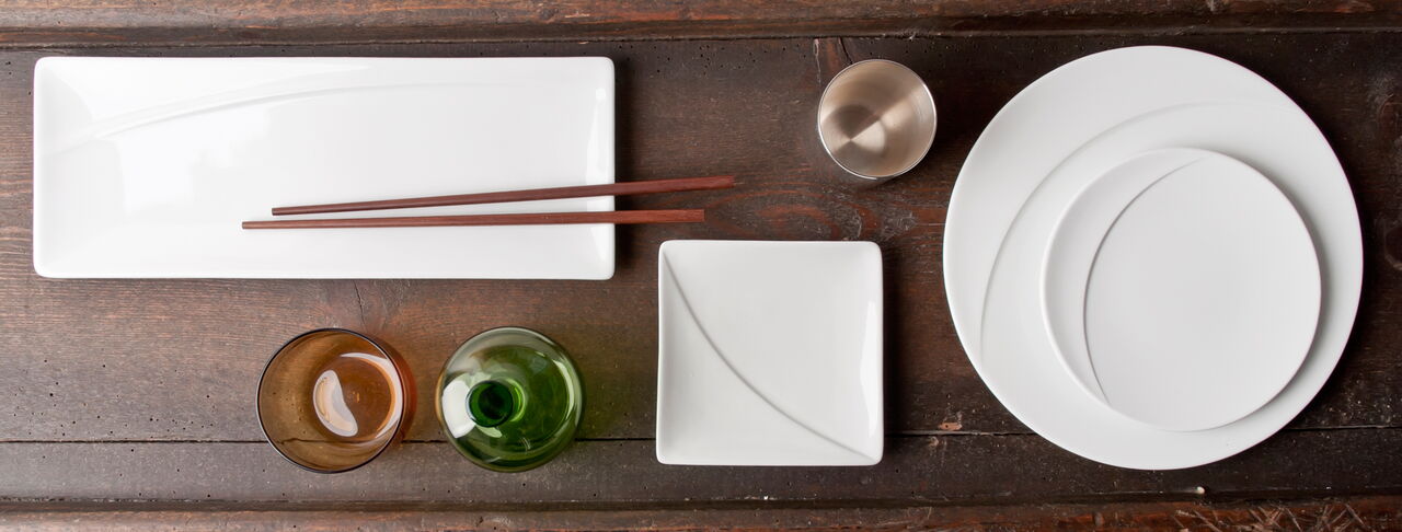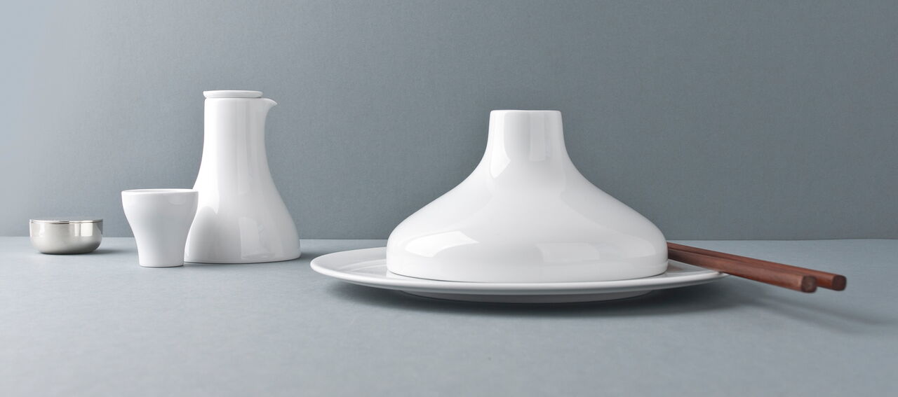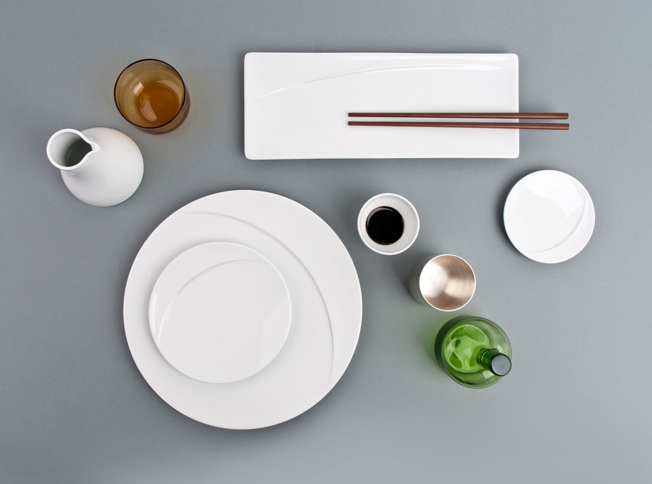 Ein Programm von runden als auch eckigen Teller bietet Chefs die Möglichkeit, von Antipasti bis Sushi jeweils auf den geeigneten Größen und Formen zu servieren. Die Cloche deckt in der asiatischen Küche einen Bambuskorb ab, indem z.B. Dim Sum gegart werden können, in der westlichen Küche können spezielle Köstlichkeiten von der Cloche versteckt auf dem Teller präsentiert werden. Alle Tassengrößen für westliche Getränke wie Tee und Kaffee finden auch Anwendung als Schalen für Reis, Suppe, Tee in der asiatischen Küche. Die Gießer sind nach westlichem Standard ausgelitert und passen doch auch z.B. als Sakeflasche zum typisch asiatischen Getränk. Ein feiner weißer Porzellan-Scherben betont die Eleganz der geschwungenen Schalen und der Kannen.