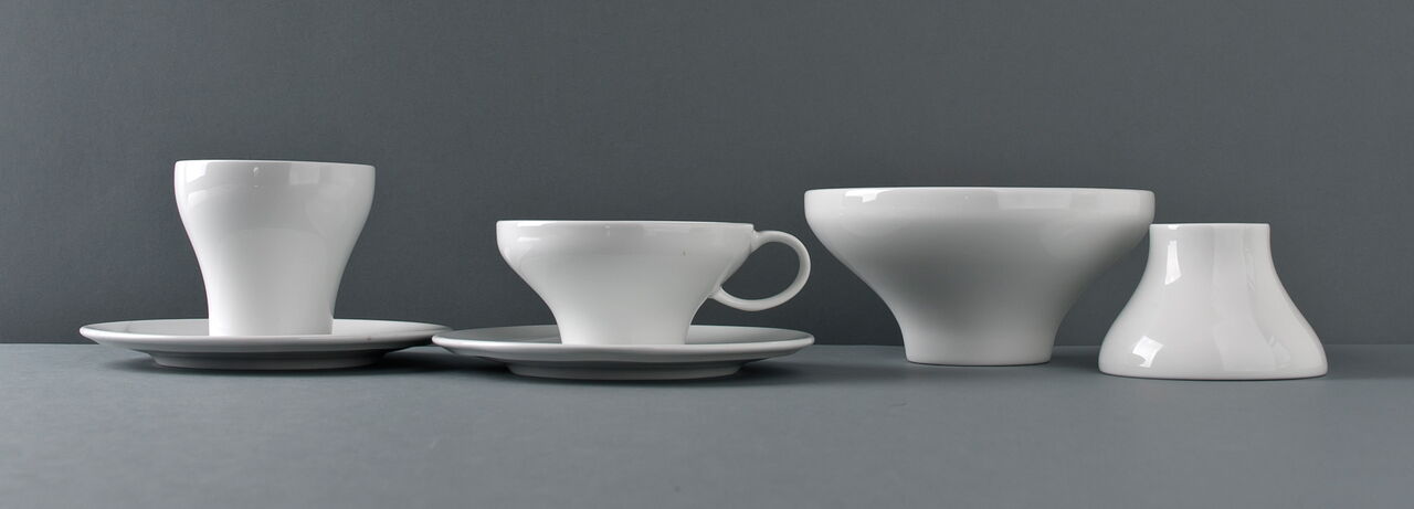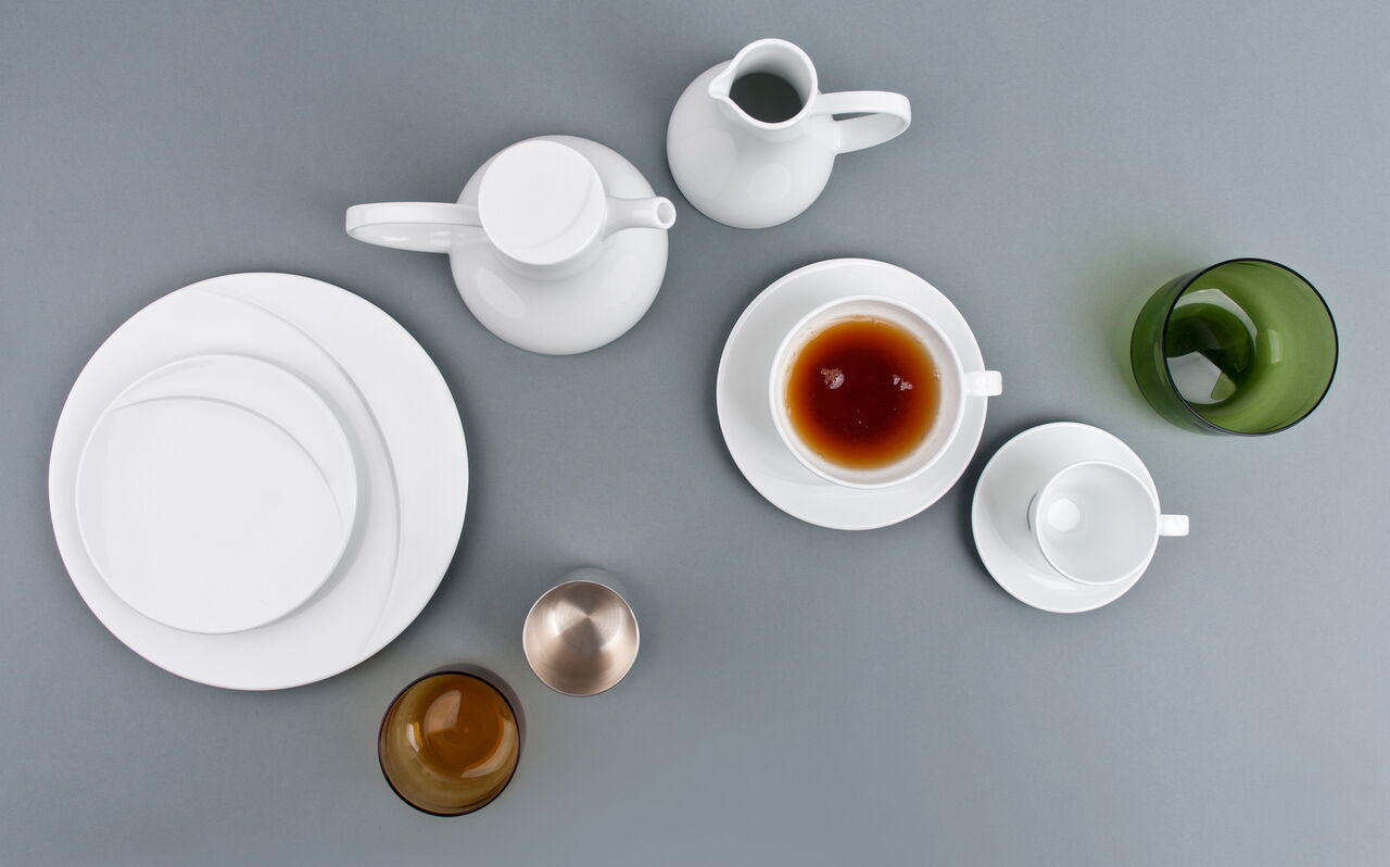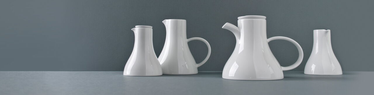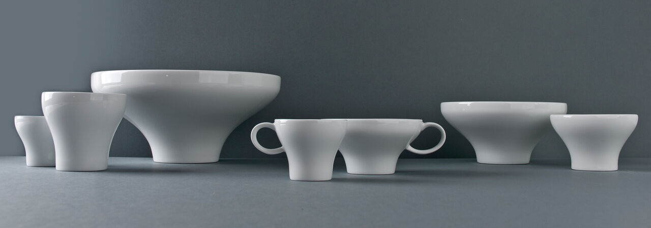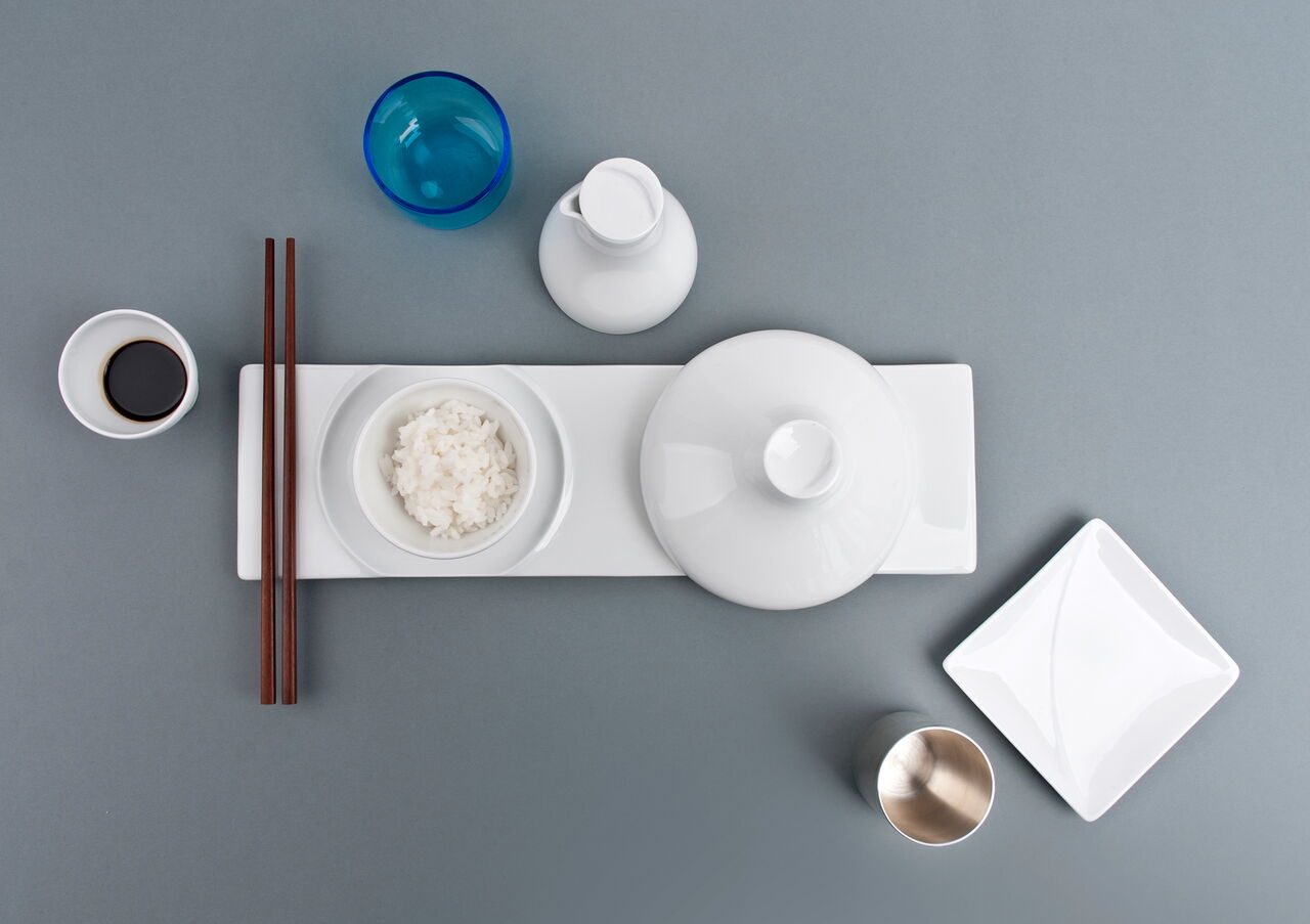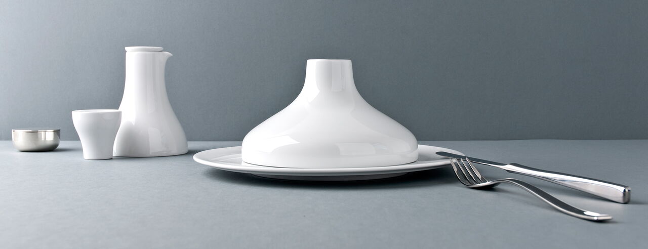 Ein Programm von runden als auch eckigen Teller bietet Chefs die Möglichkeit, von Antipasti bis Sushi jeweils auf den geeigneten Größen und Formen zu servieren. Die Cloche deckt in der asiatischen Küche einen Bambuskorb ab, indem z.B. Dim Sum gegart werden können, in der westlichen Küche können spezielle Köstlichkeiten von der Cloche versteckt auf dem Teller präsentiert werden. Alle Tassengrößen für westliche Getränke wie Tee und Kaffee finden auch Anwendung als Schalen für Reis, Suppe, Tee in der asiatischen Küche. Die Gießer sind nach westlichem Standard ausgelitert und passen doch auch z.B. als Sakeflasche zum typisch asiatischen Getränk. Ein feiner weißer Porzellan-Scherben betont die Eleganz der geschwungenen Schalen und der Kannen.