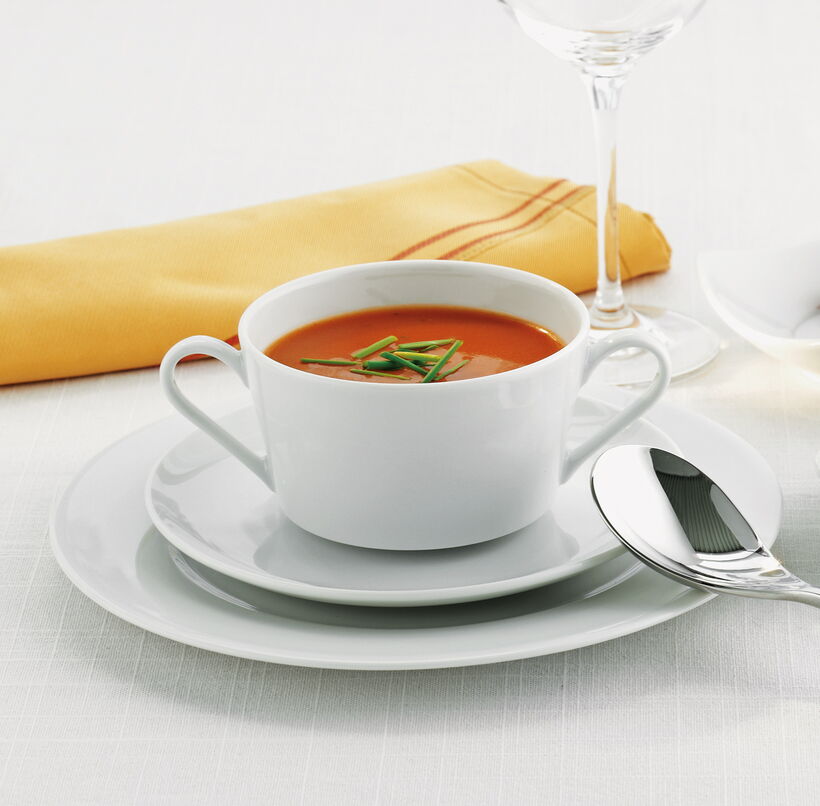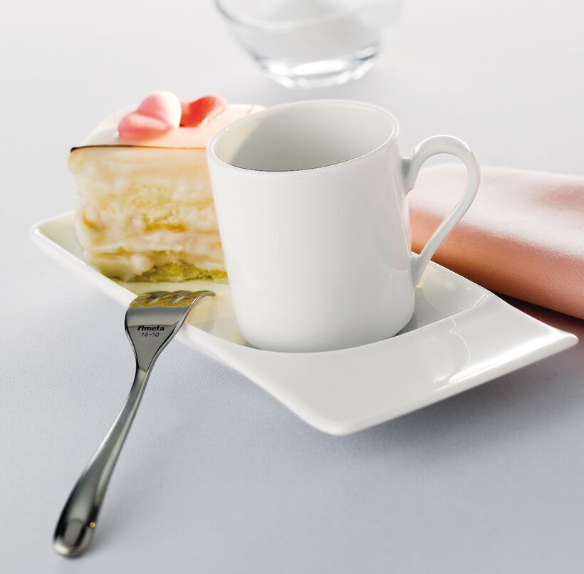 Based on only three pieces, this design offers a variety of combinations. By lining up the platters, their curves form a surprising and pleasant pattern. Fine Dining is a modern space-saving buffet collection. Four cups complement the set.