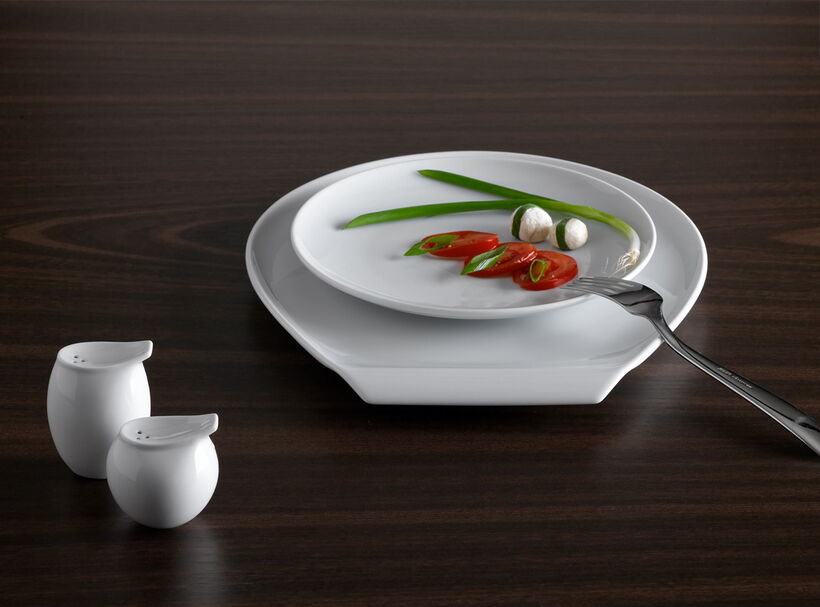 The basic idea of Multiforma is a combination of elliptical and round shapes, which move into a curled straight edge. These forms are combined with oval and round plates and platters. The curved band has a functional advantage too: it is very comfortable to grip. This combination of an elliptical and a round shape, which move into a curled edge is repeated on the lid of the coffee- and teapots and on the salt - and peppershaker. This connects hollow- and flatware in harmony and gives the forms an extraordinary expression of soft elegance with a clear and modern attitude.