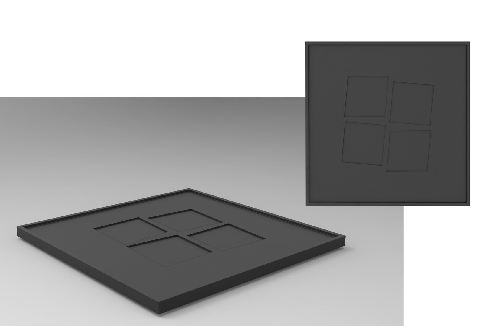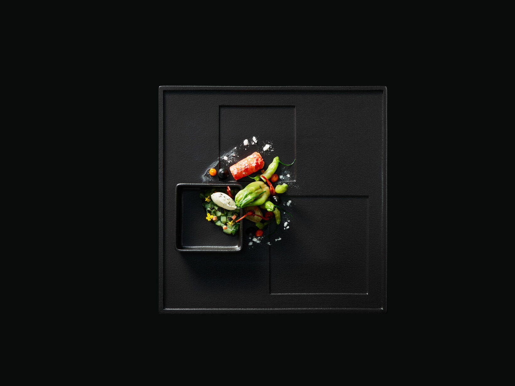 This exclusive range consists of eight square platters (30 x 30 cm) with varying graphically organized lower and higher levels, on which round, square and rectangular bowls can be used for high-end food presentations. The black iridescent glaze gives the platters an exclusive and unique elegance.