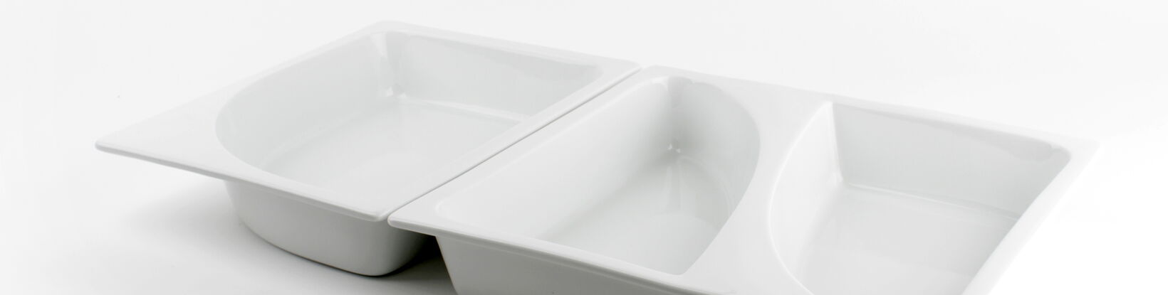 This buffet service was designed to be used with buffet display warmers and therefore has to comply to Gastronorm sizes. The overall shape needs to be rectangular, but the design of the subdivisions is what gives Zamma its character: In contrast to the rigid external shape, the container is divided into two asymmetric parts by generous swinging lines. This allows two different foods to be served in one container. A wonderful composition of form and food emerges when different-sized containers are arranged together on the buffet.