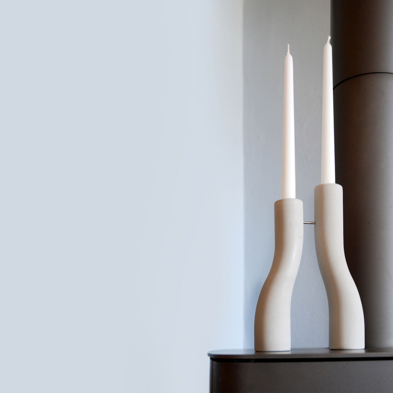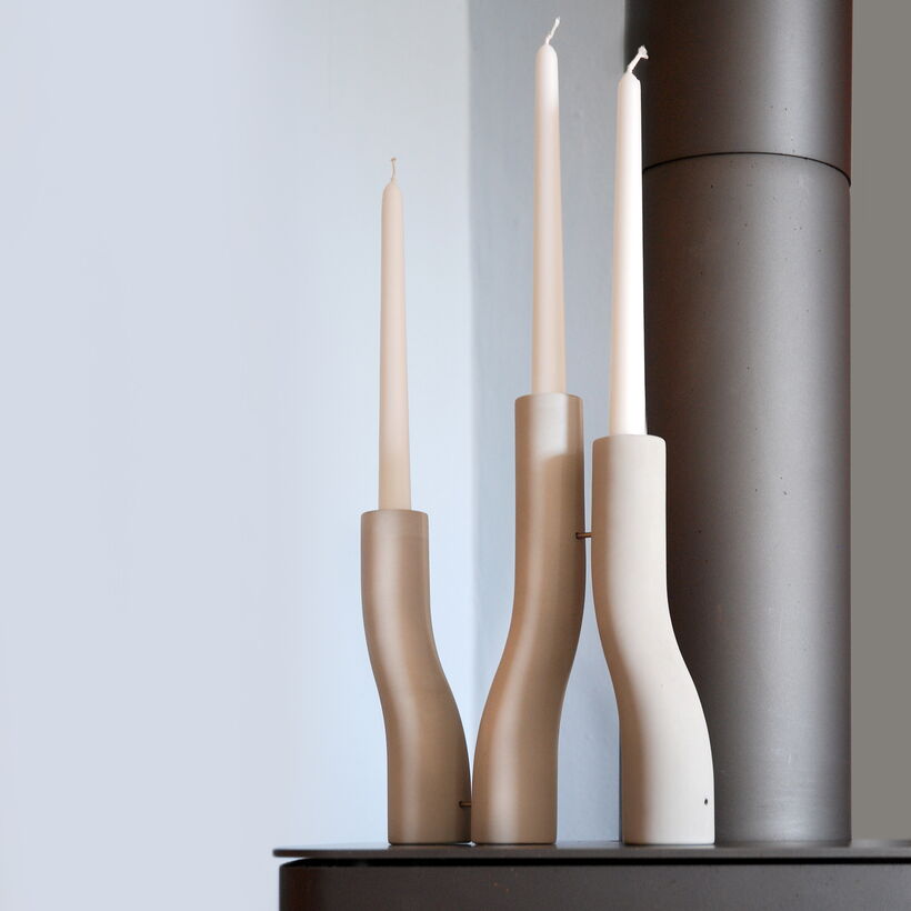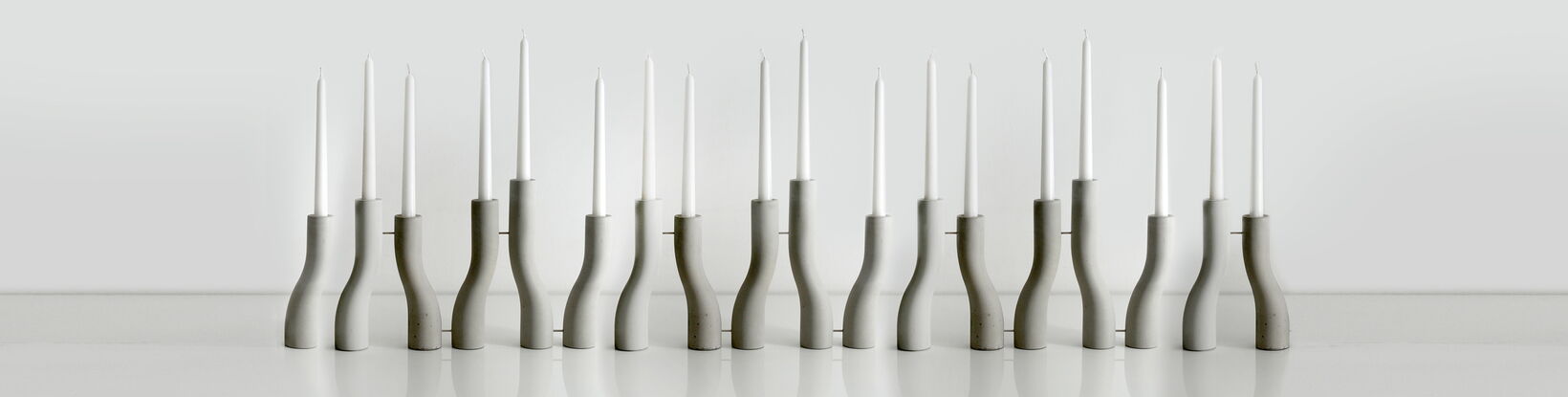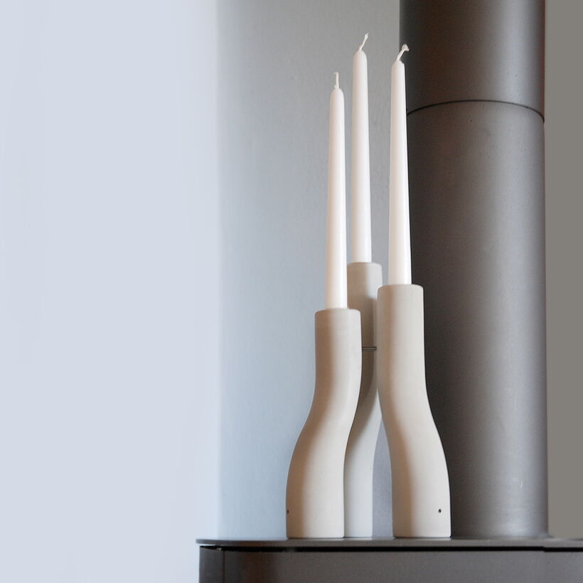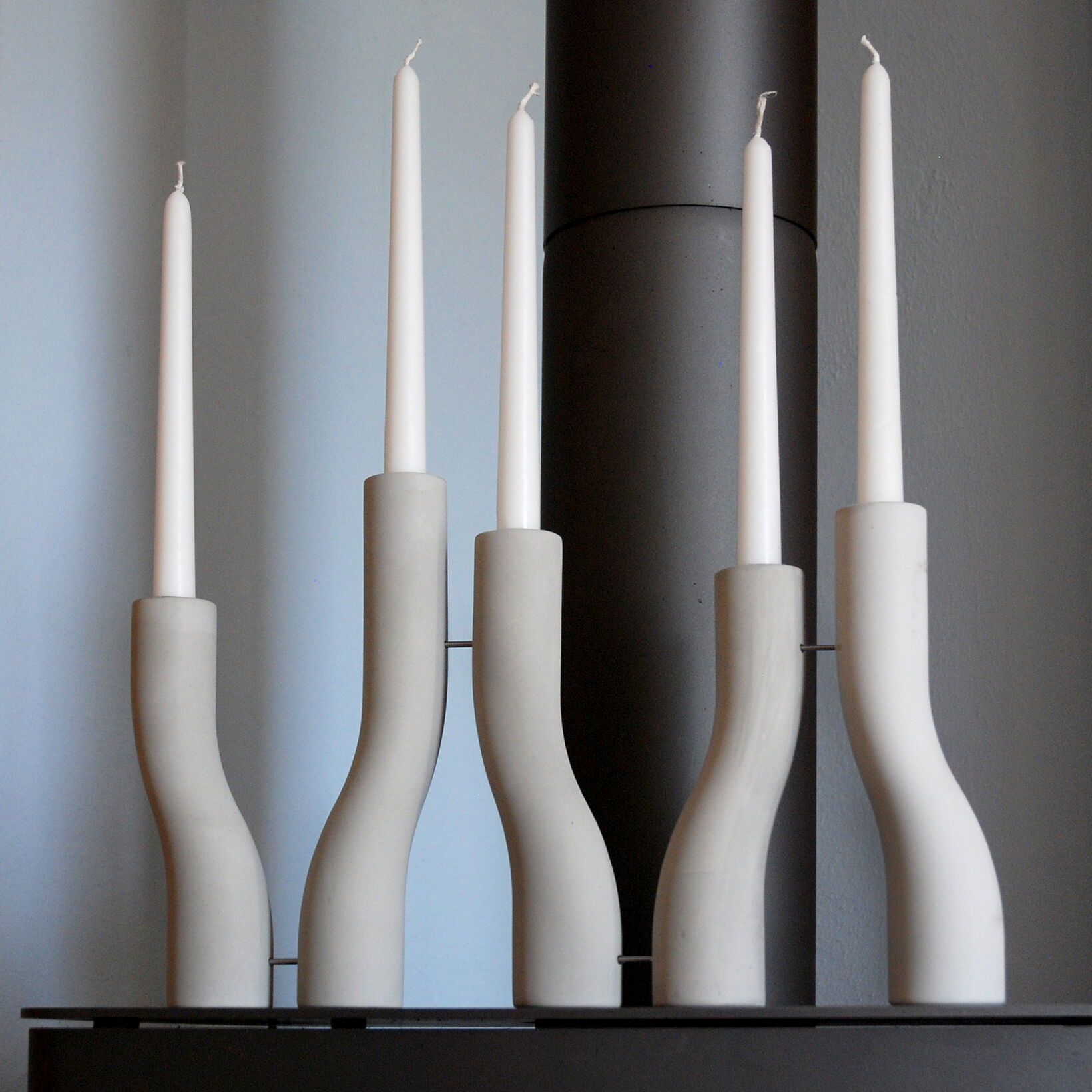 Swinging columns of concrete in 3 heights form an attractive and flexible combinable system of candleholders. You can build groups of 2, 3 or for example 5 candleholders, which are easily to combine to bigger architectural formations. Metal sticks connect the various combinations of candleholders.