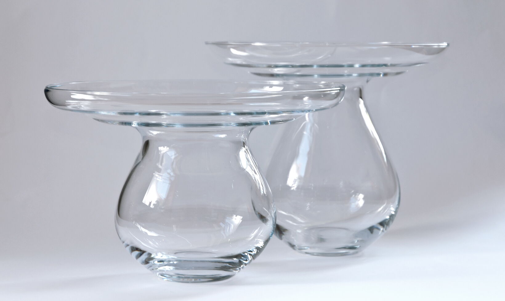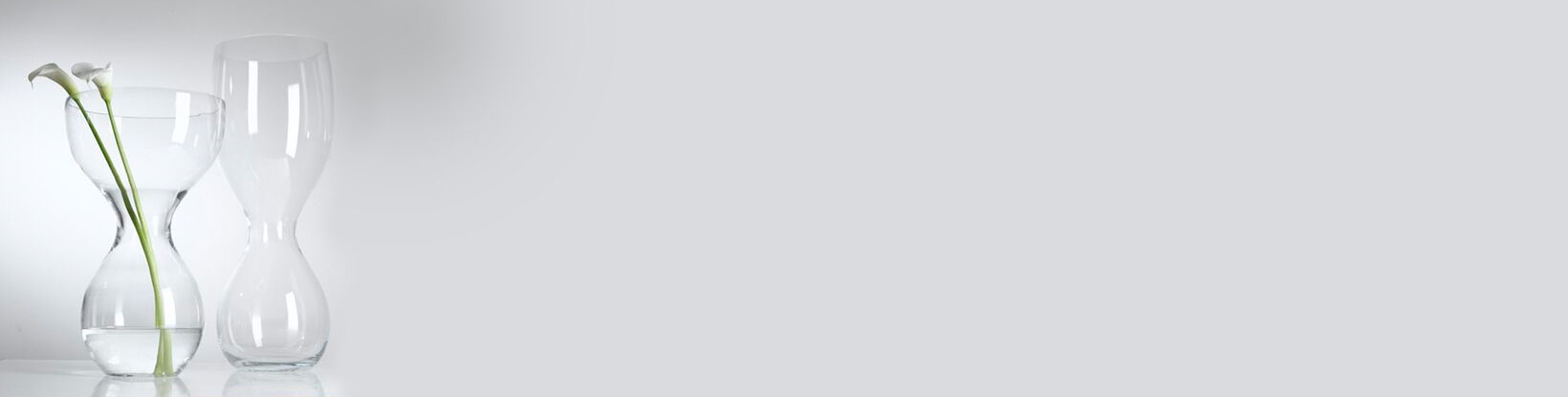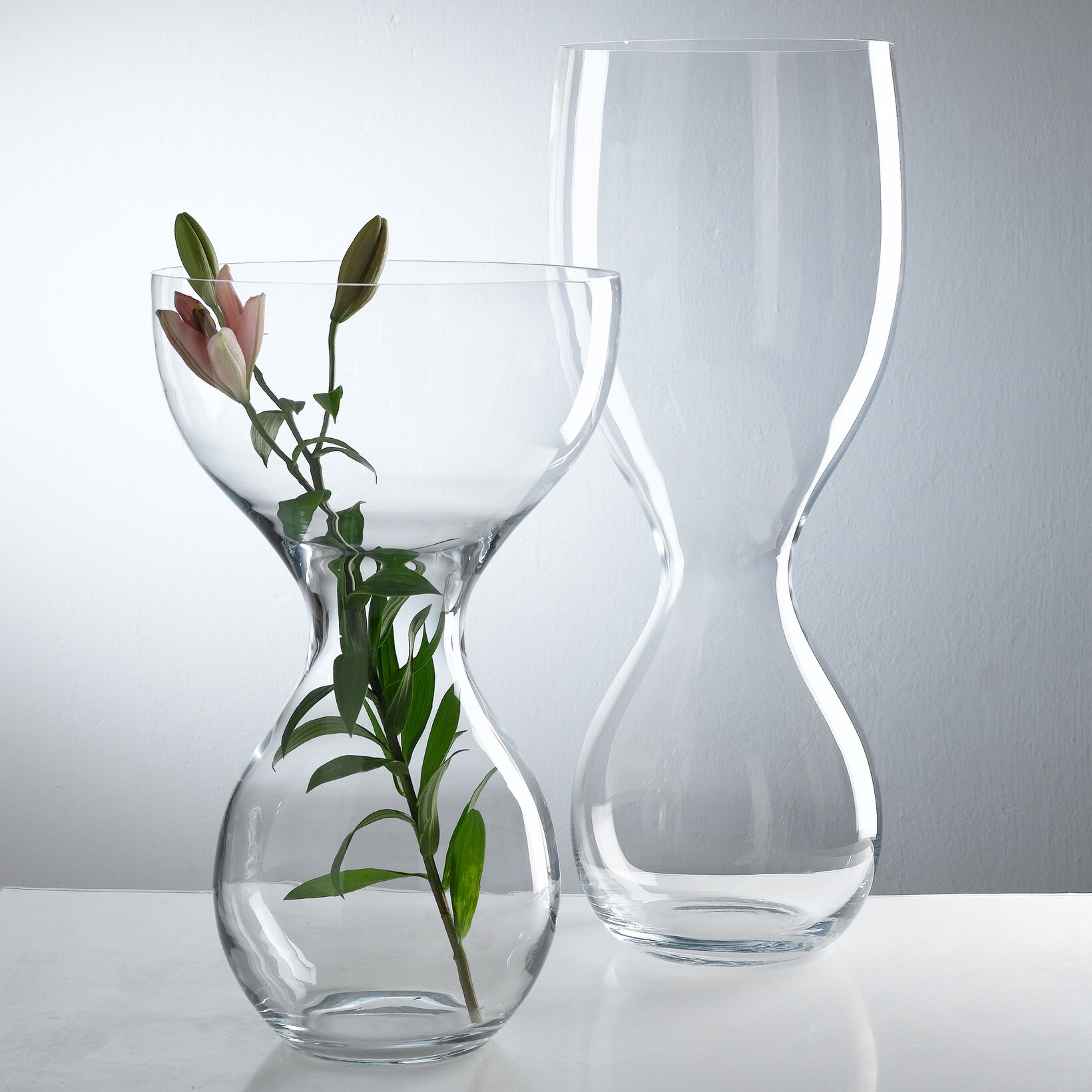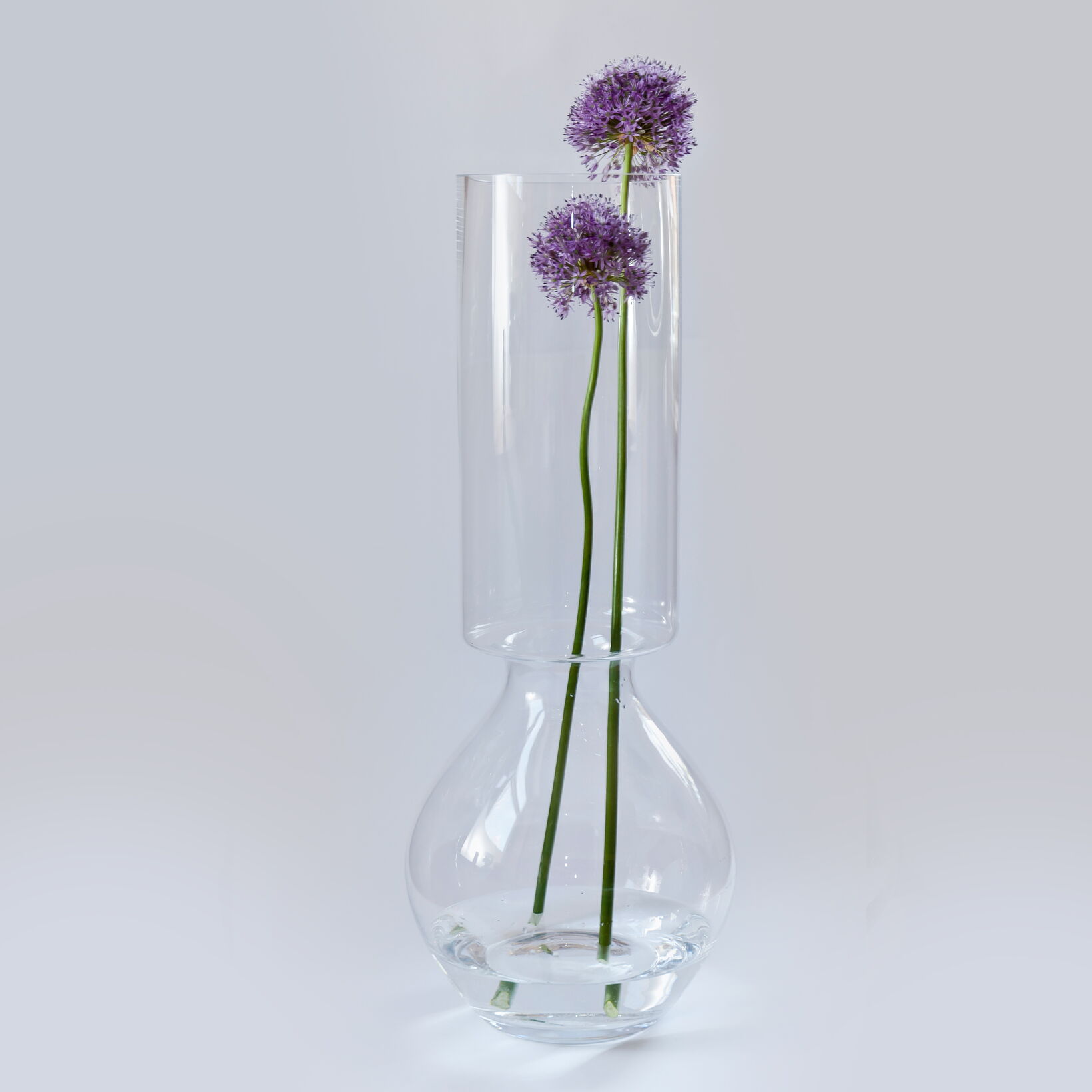 This elegant floor vase with its soft waist is meant to display individual blossoms. The flower is meant to sit inside the top glass volume and the reflection of the glass adds to the visual pleasure.