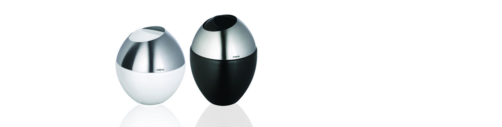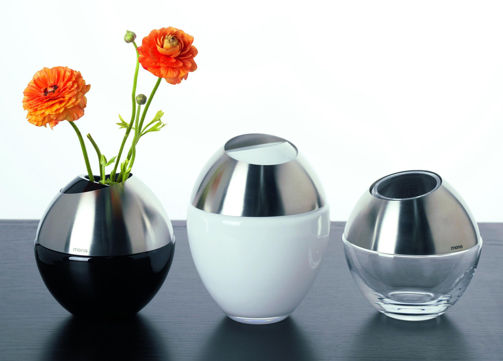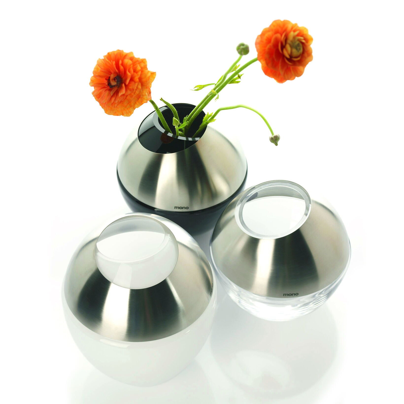 The opening of the vases can be narrowed or increased rotating the stainless steel top to suit the flower arrangement. The elegant vases in white, black or clear glass are each combined with a polished stainless steel top.