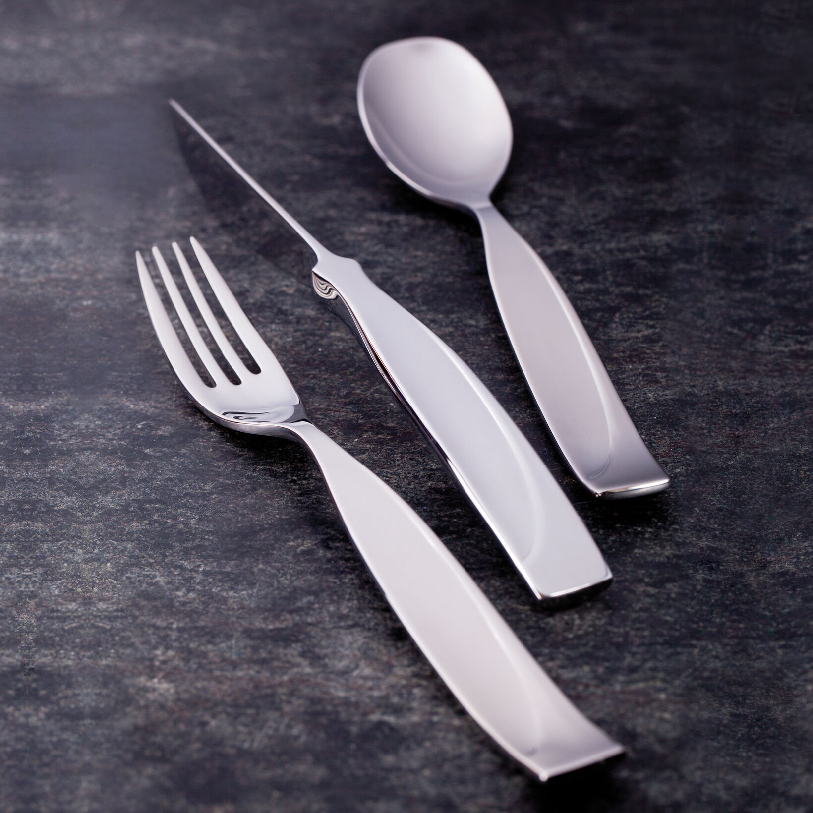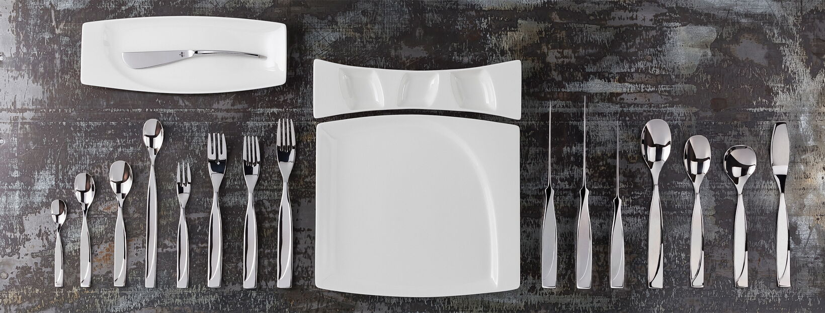 MAZZA is an elegant cutlery with a soft rolling shape and a narrow waist. It sports a softly curved line as relief, which refers to the MAZZA porcelain. The knife, curved in one soft line, can also stand on the blade for better gripping.