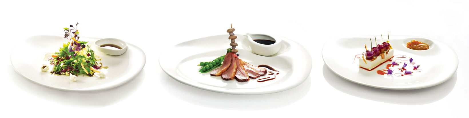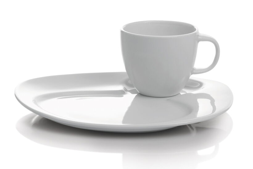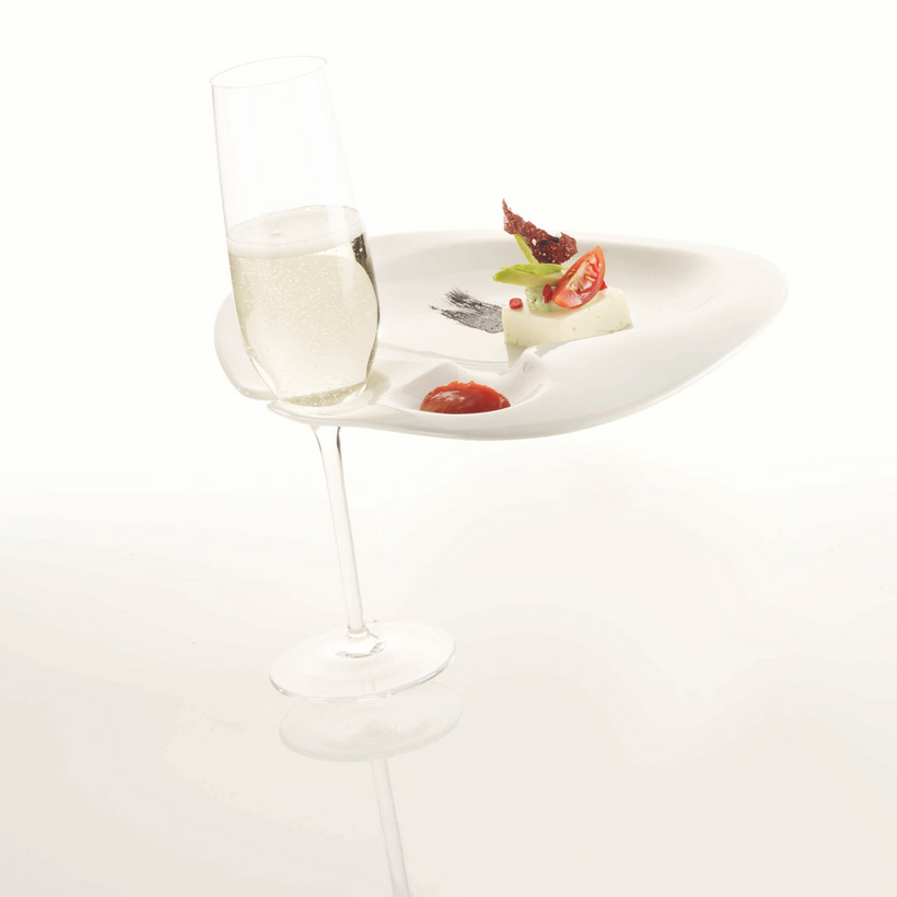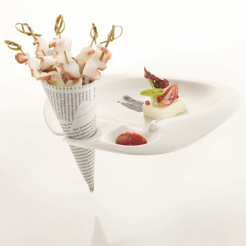 Softly curved asymmetrical forms inspired by nature are typical of the service Nabur. The brilliant warm white together with its individual aesthetics make it a perfect stage for culinary creations. It also meets practical demands, because it is stackable, durable and offers endless combinations between the different elements. The soft organic forms of bowls and sauceboats in different sizes can be creatively combined with each plate. The „Party Plate“ is perfect for receptions and cocktail parties: It is easy to hold and simplifies the handling of the glass: Any stemware glass dangles in a recessed hole – so that the party guest is free to move with plate and glass in one hand. The “Party Plate” is perfectly stackable even with its free-flowing asymmetrical form.