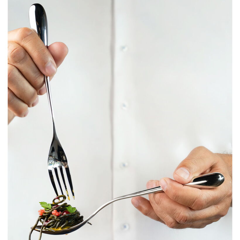 The rounded Rezzo cutlery is very balanced and lightweight because the handles are hollow. The volume at the end of the handle provides a comfortable feeling when gripping.