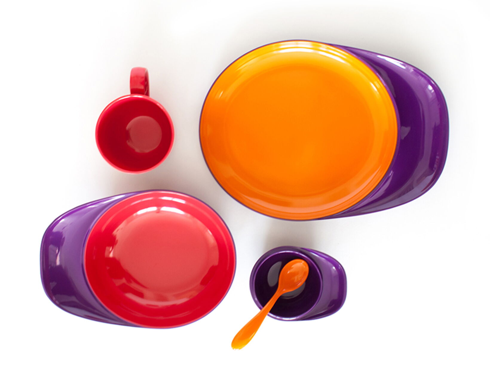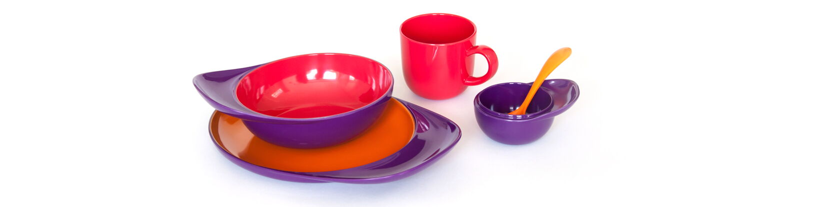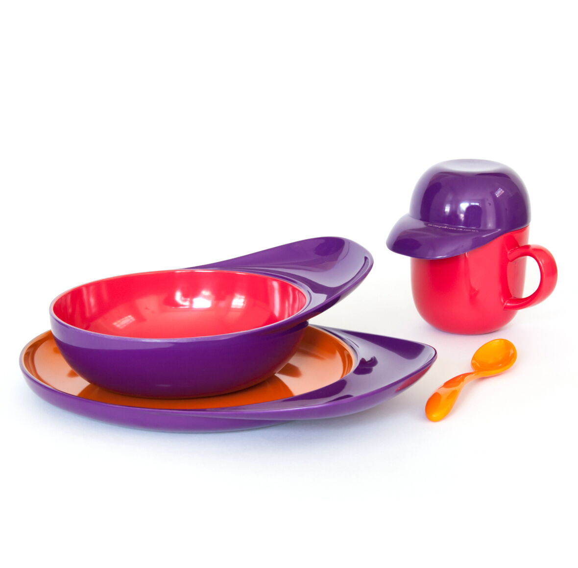 We started searching for a simple, bright and suitable shape for children and came across the iconic image of the baseball cap, loved by young and old in all countries. We used this cultural object to develop a range of children ́s dinnerware, by translating the visor into a broad handle for plates, cereal bowls and lids. The smallest snack-bowl can also be an insect-lid for the mug. Every child will love the colours (different inside and out) and even the youngest will find BOBO very easy to handle.
