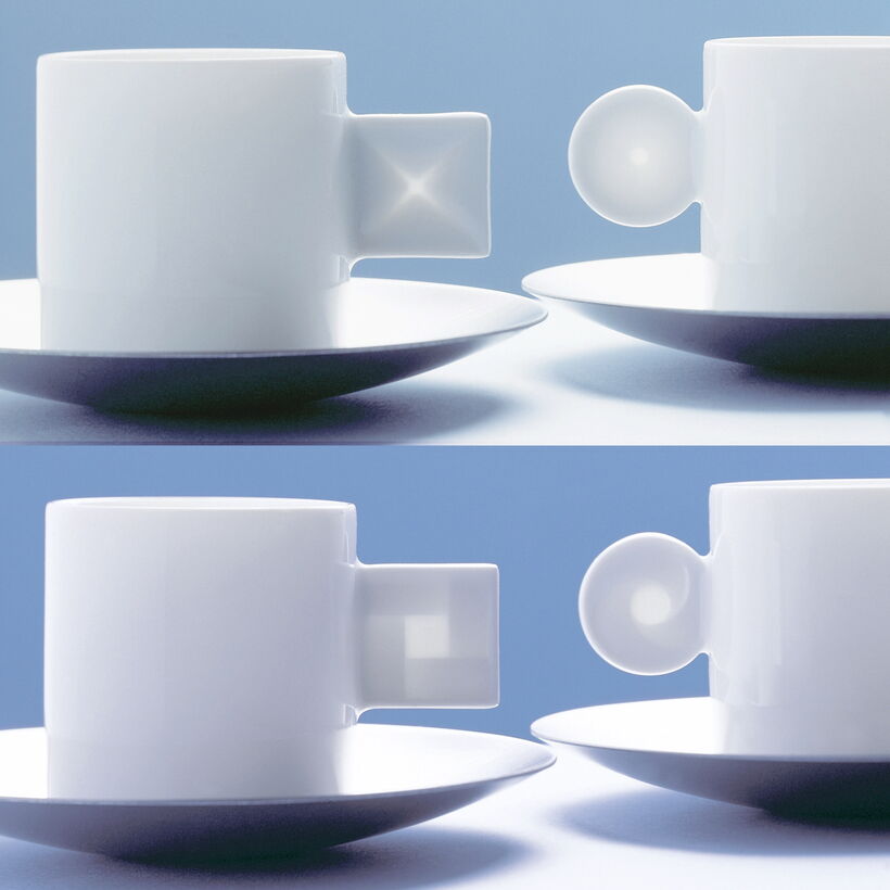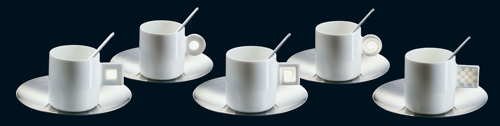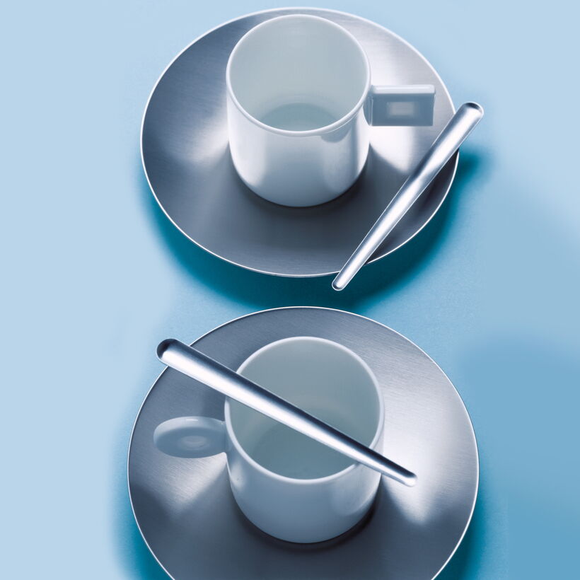 Doppio is a charming series of espresso cups that is being expanded to include new sets. The thin porcelain cups have either a square or a round handle with a three dimensional translucent design in a lithophanic effect. Contrast is achieved with saucers and stirrers in stainless steel.