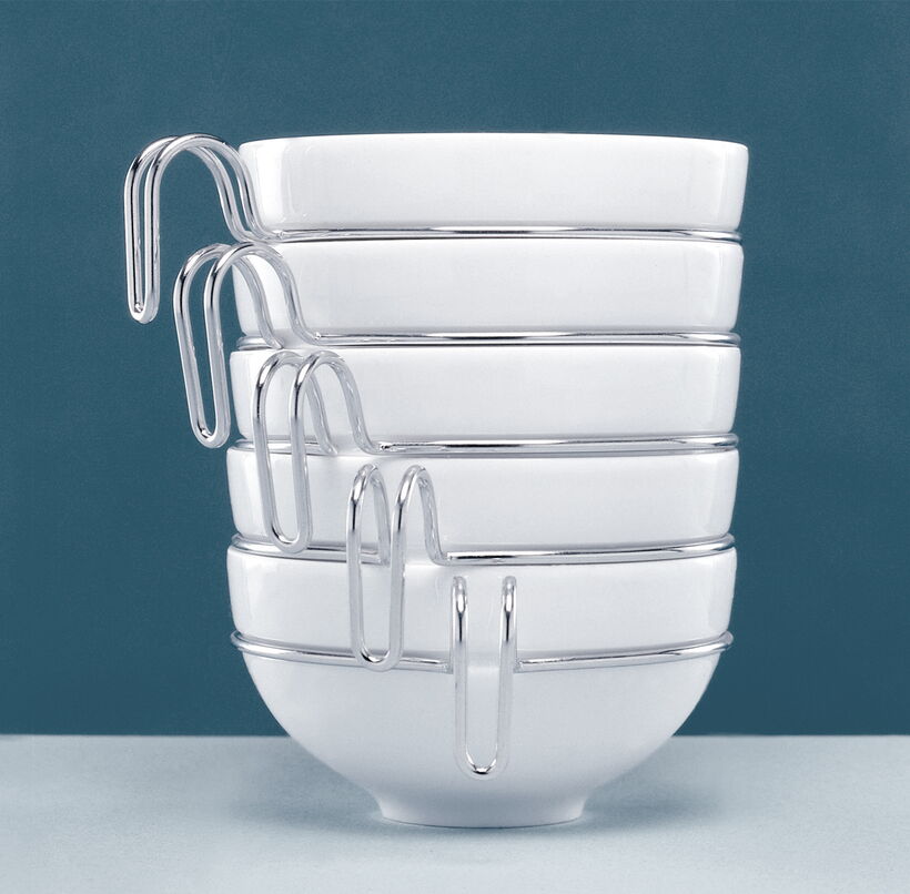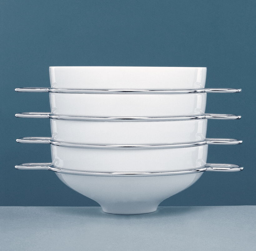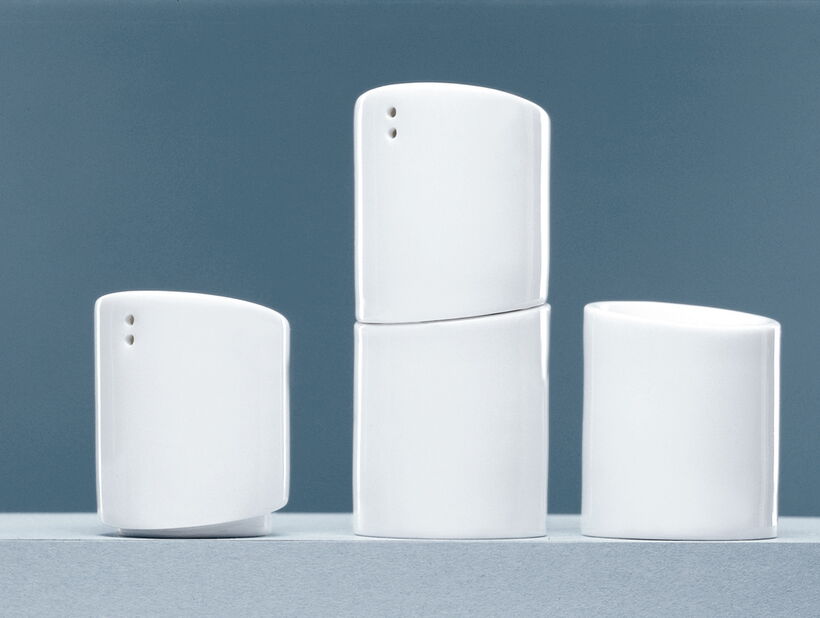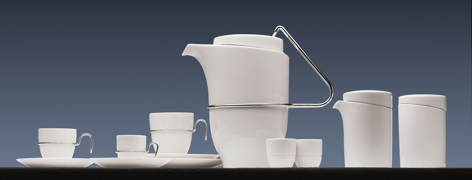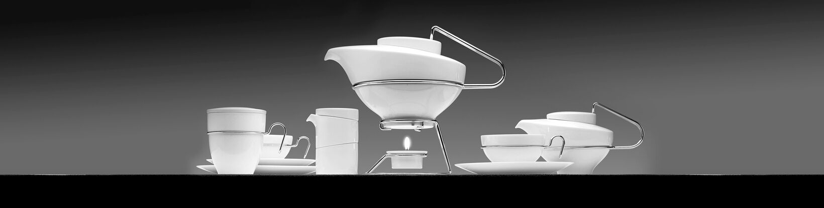 The combination of porcelain and stainless steel makes Geminii unique. Most notable is the abundance of intelligent details like the teapot handle that holds the lid in place while pouring and the cantilevered warmer with its free-hanging tea candle. All saucers have a convex centre instead of the usual indentation. All cups are stackable, with the metal ring serving as stacking guide. The teapot with integrated tea strainer is as elegant as it is functional: the handle holds the lid in place while pouring. The tea and coffee services are completed with a sugar bowl and cream jug, available either individually or in the stacked version. The dinner service is inviting through its generous proportions. A complete set includes dinner plate, pasta and salad plate, soup cup and saucer, bowls, serving dishes, gravy boat, and a stacking salt and pepper shaker. All cups stack safely on the stainless steel ring; the place setting, sugar pot with creamer stack too.
