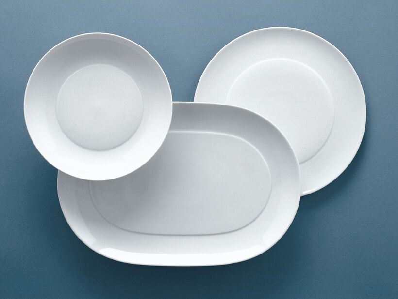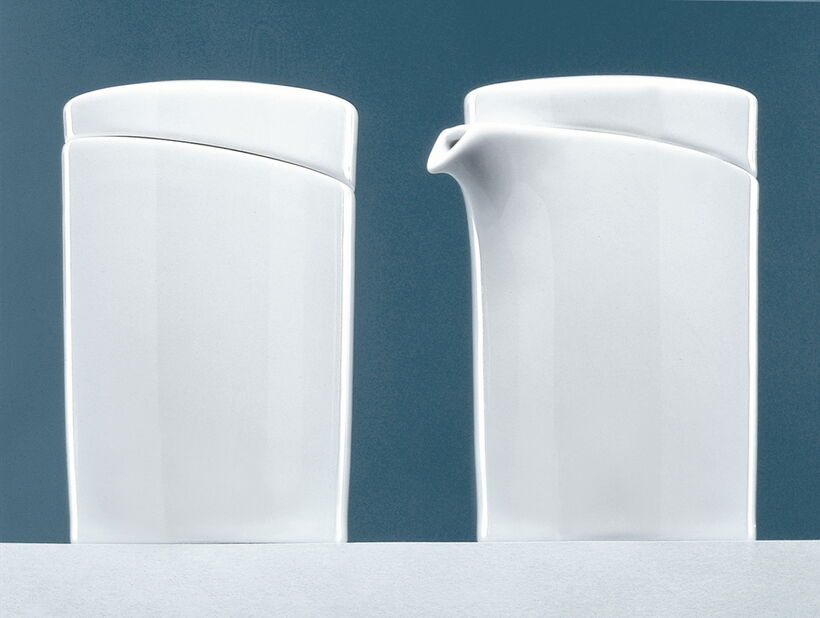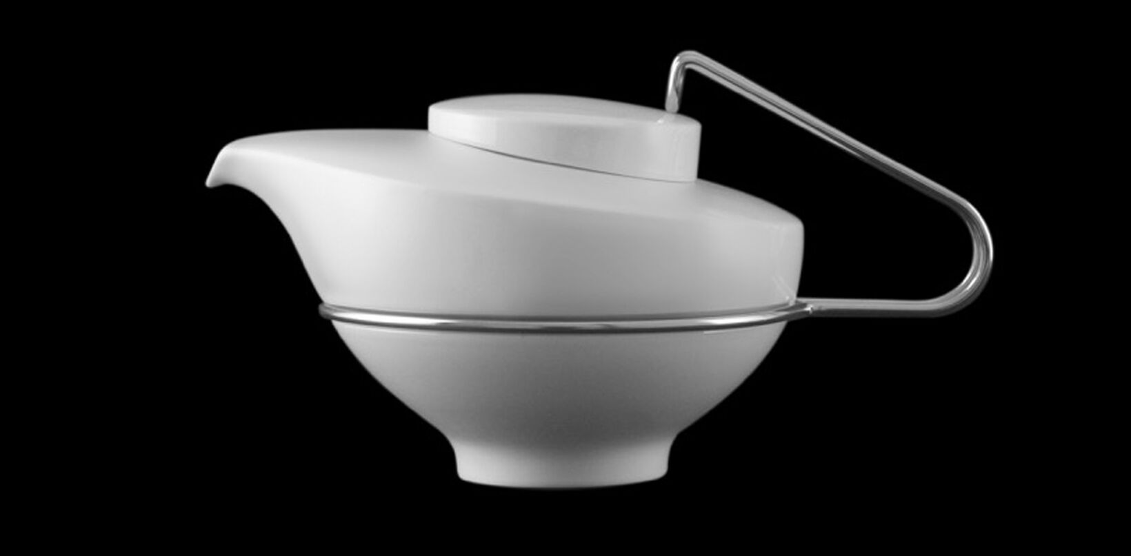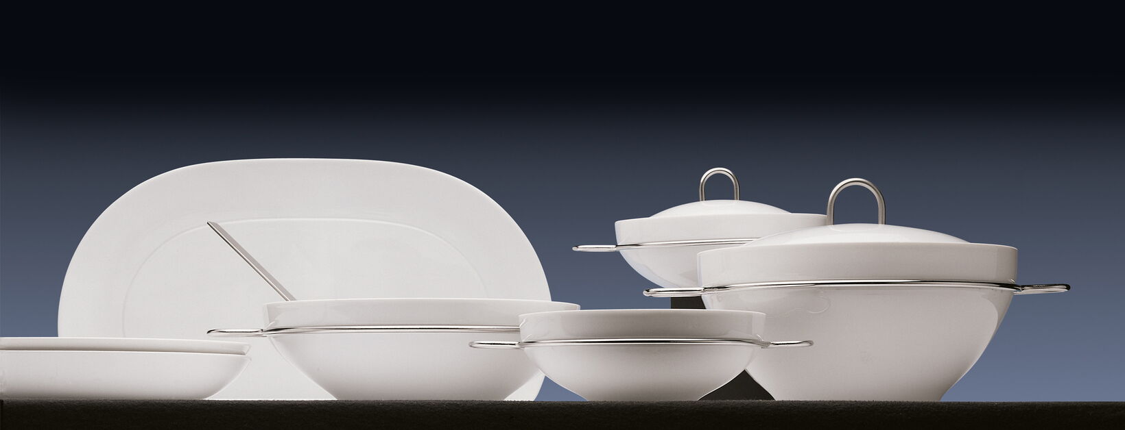 The combination of porcelain and stainless steel makes Geminii unique. Most notable is the abundance of intelligent details like the teapot handle that holds the lid in place while pouring and the cantilevered warmer with its free-hanging tea candle. All saucers have a convex centre instead of the usual indentation. All cups are stackable, with the metal ring serving as stacking guide. The teapot with integrated tea strainer is as elegant as it is functional: the handle holds the lid in place while pouring. The tea and coffee services are completed with a sugar bowl and cream jug, available either individually or in the stacked version. The dinner service is inviting through its generous proportions. A complete set includes dinner plate, pasta and salad plate, soup cup and saucer, bowls, serving dishes, gravy boat, and a stacking salt and pepper shaker. All cups stack safely on the stainless steel ring; the place setting, sugar pot with creamer stack too.