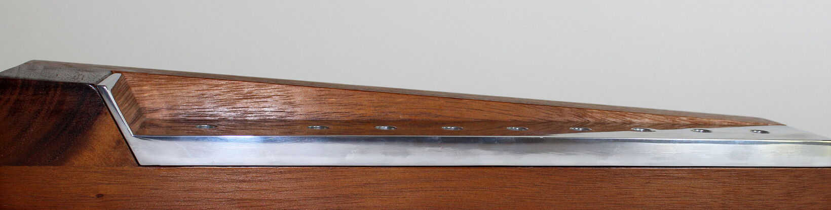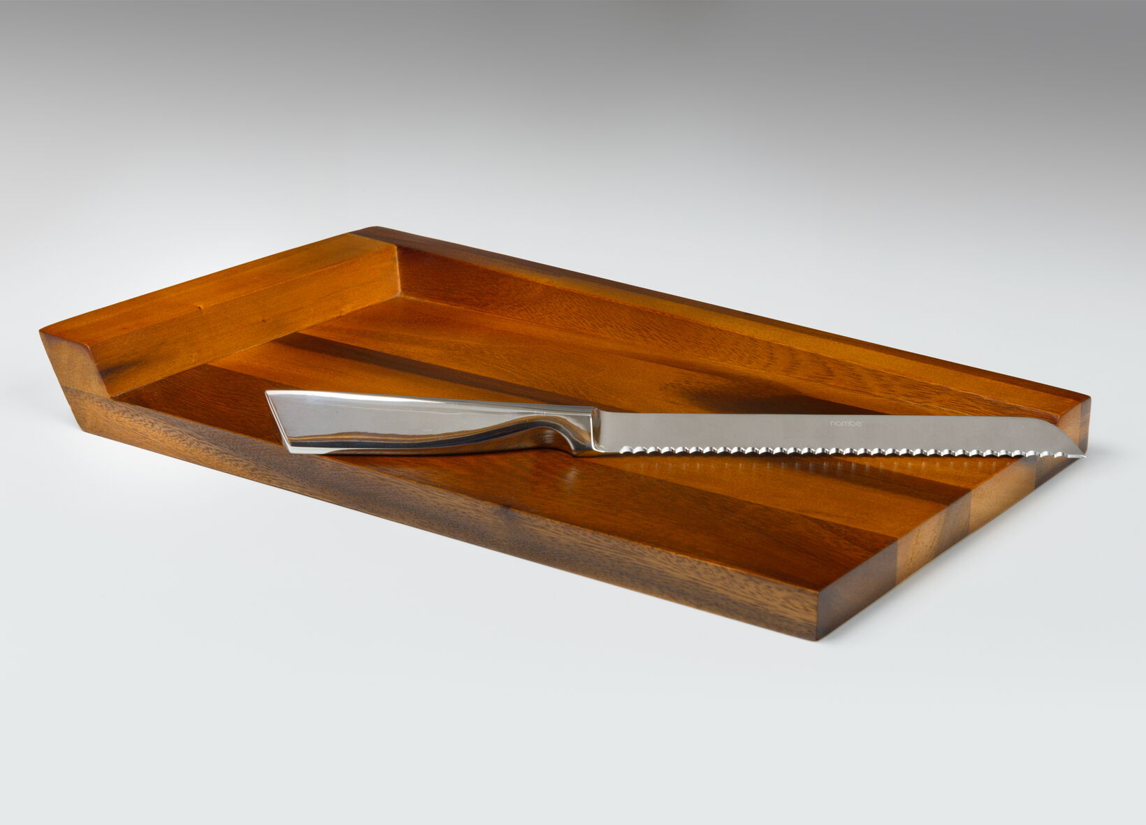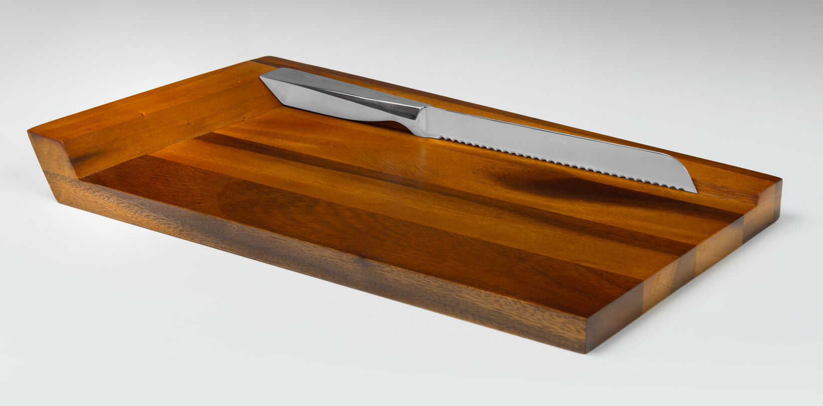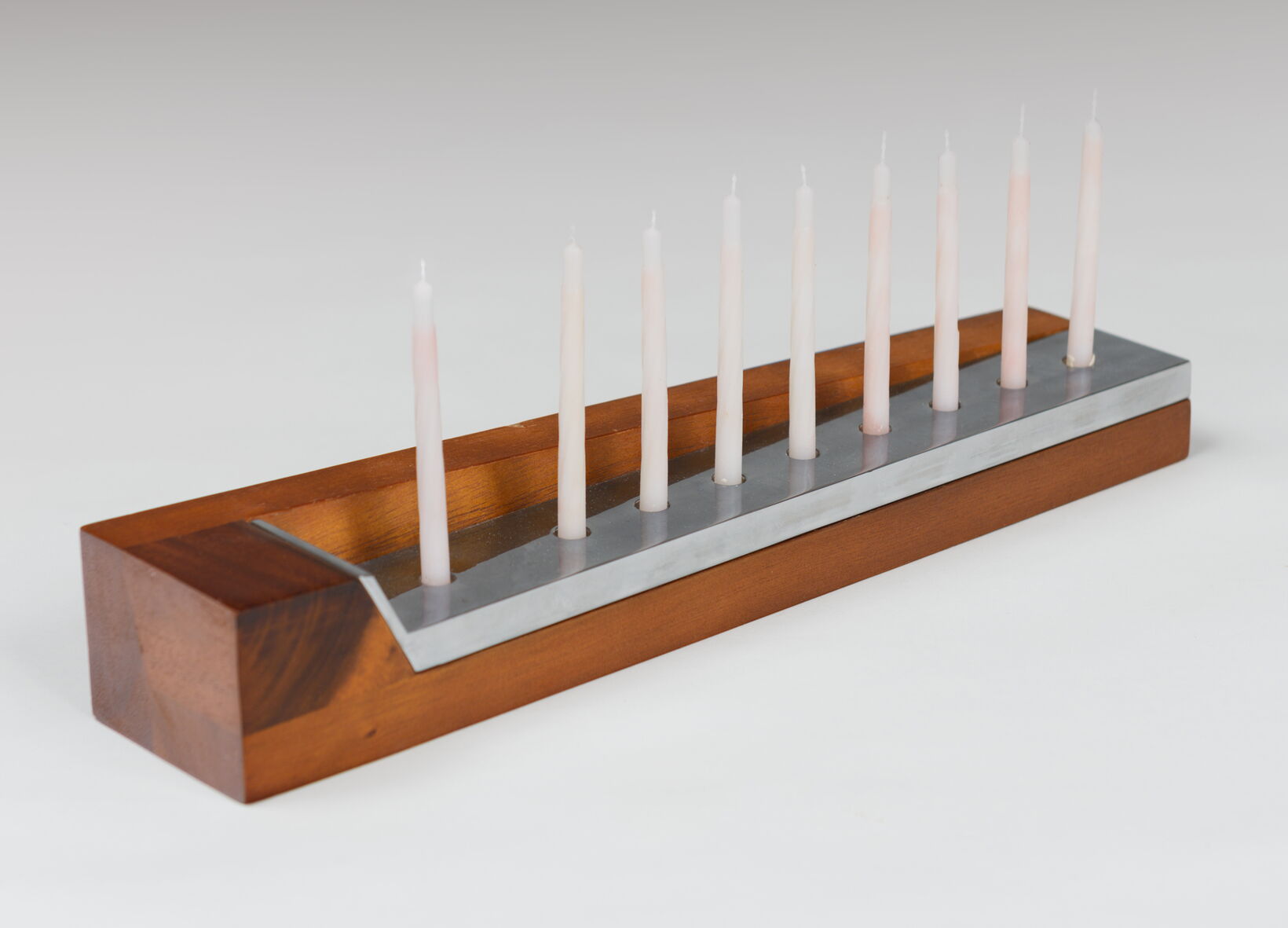 One item of the range is a Challah board with a stainless steel bread knife, which is positioned with a magnet onto the board. Other items are a menorah candleholder for 8 candles, two Sabbath candlesticks, one Seder plate with 8 bowls, a Kiddush cup and a dreidel. The material combination of wood and zinc and the strong geometry