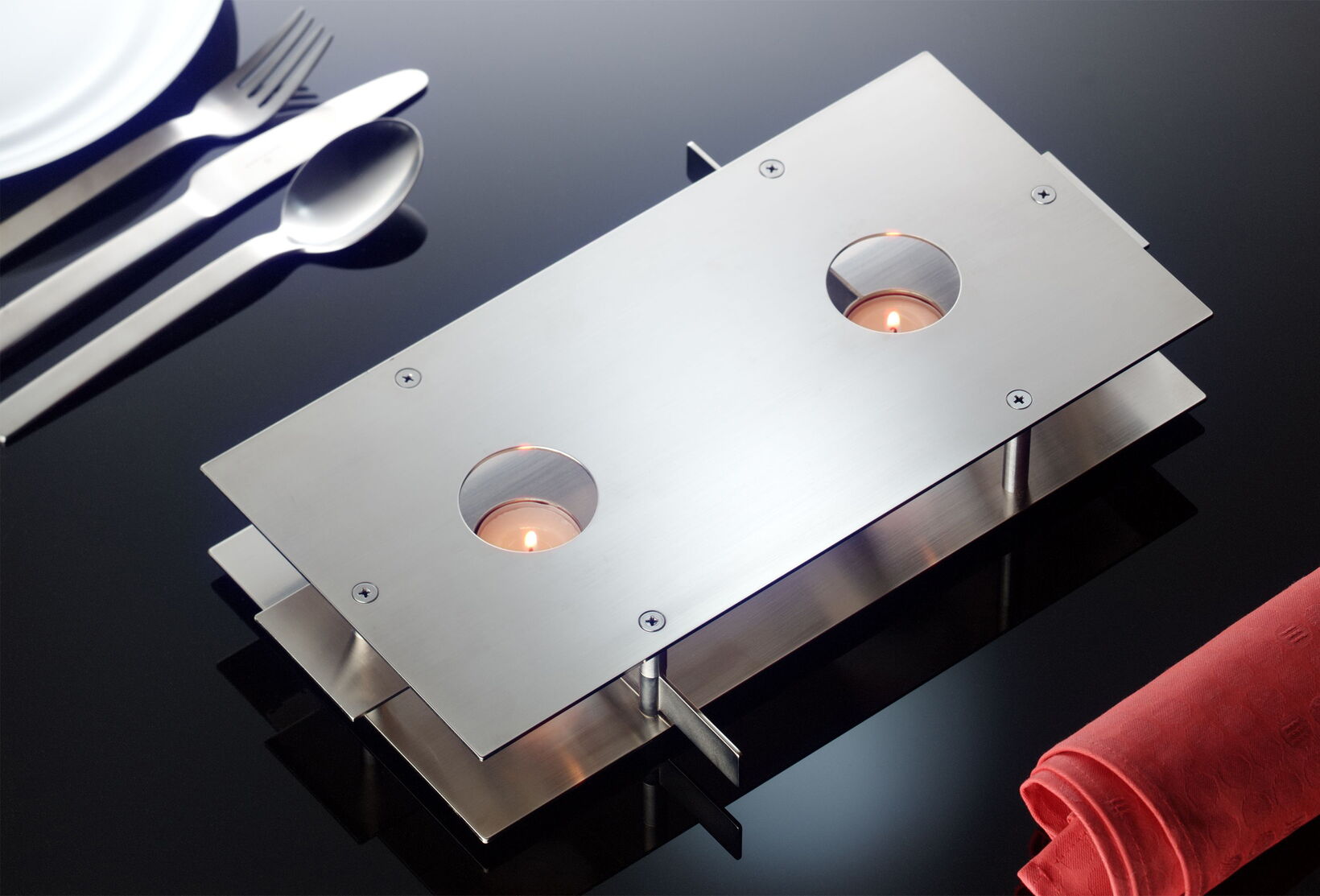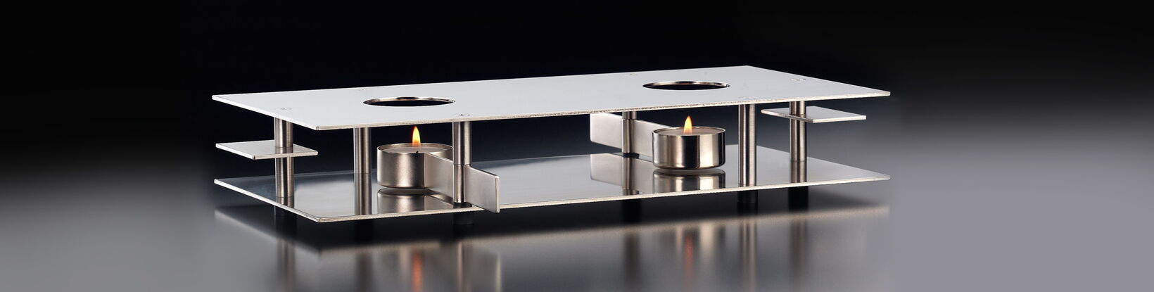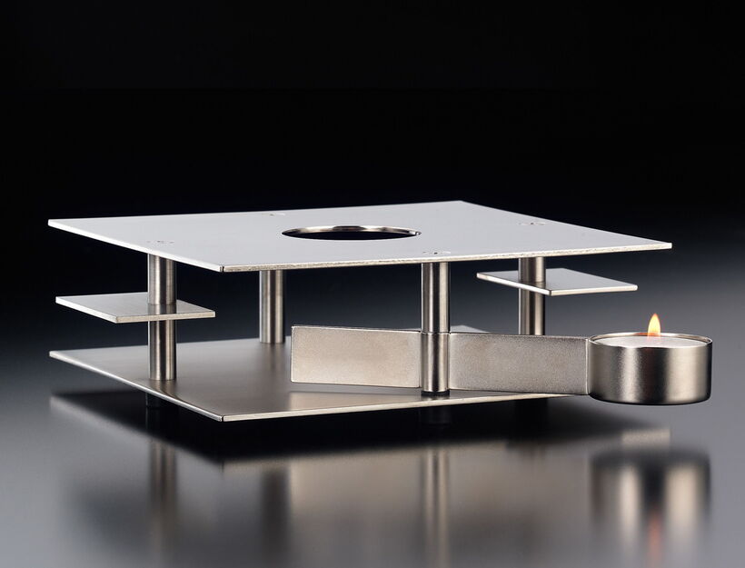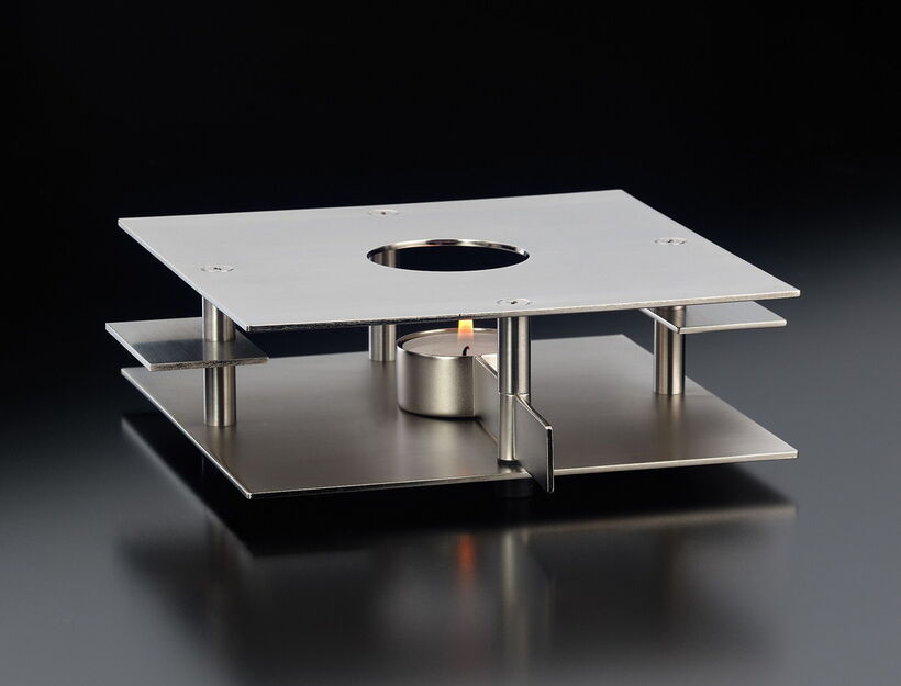 The innovation in this rechaud is the lever for the tea light holder: It allows the candle to be accessed without lifting the pot. This same ingenious device works for the square teapot warmer and the rectangular food warmer.