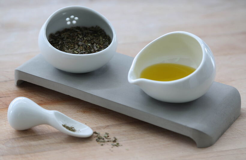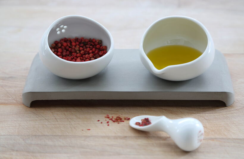 U-Spice are innovative products which allow to use fine seasoning of any kind at the table and for the individual taste of each person at the table. The series consists of one spice bowl for spreading, one bowl for pouring, one mortar spoon and a concrete tray. The spice bowl makes it easy to apply just the right amount of spice with their small holes. At the same time the specific spice can be portioned with the fingers or a spoon as well. The bowl is perfect for mixing fluids with seasoning and pouring the essence over food. An entirely new “two in one” device is the combination of mortar and spoon: For grinding herbs you can either grip the mortar in the common way or the thumb can rest in the cavity of the spoon. And the spoon is just right for portioning the grinded seasoning.