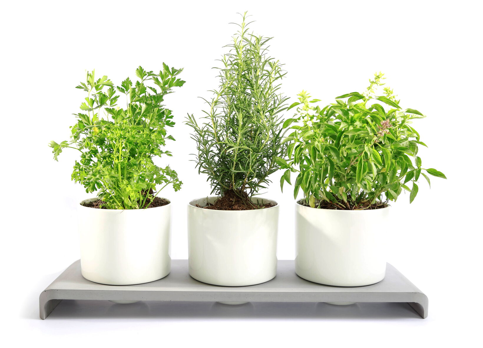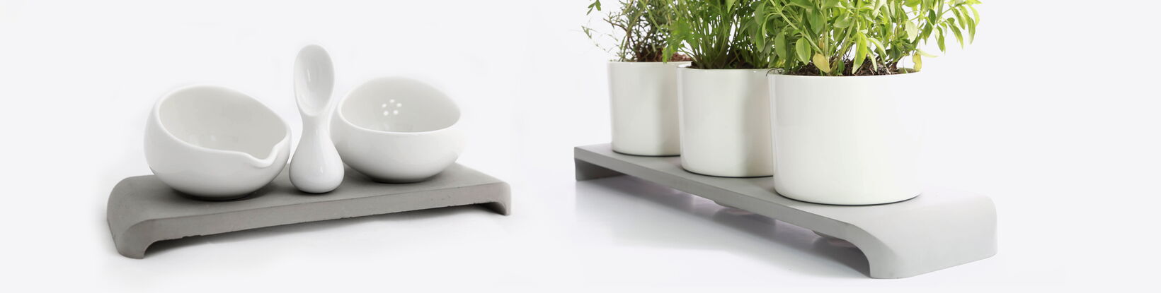 Fresh herbs stay in these porcelain pots fresh for a long time, because the lower part of the pots keeps a reservoir for water. The shiny porcelain contrasts the rough and satin finished surface of the concrete-tray nicely. The U-shape of the tray furthermore gives the pots the impression of floating.